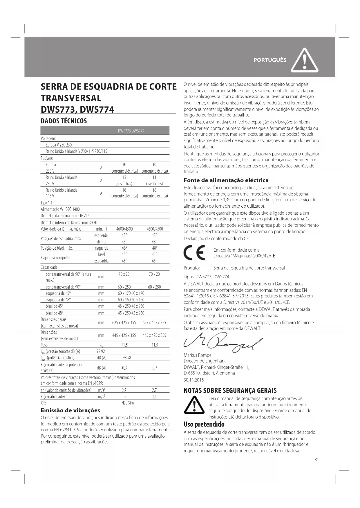 1,5 1,5 XPS Não Sim Emissão de vibrações O nível de emissão de vibrações indicado nesta ficha de informações foi medido em conformidade com um teste padrão estabelecido pela norma EN 62841-3-9 e poderá ser utilizado para comparar ferramentas. Por conseguinte, este nível poderá ser utilizado para uma avaliação preliminar da exposição às vibrações. O nível de emissão de vibrações declarado diz respeito às principais aplicações da ferramenta. No entanto, se a ferramenta for utilizada para outras aplicações ou com outros acessórios, ou tiver uma manutenção insuficiente, o nível de emissão de vibrações poderá ser diferente. Isto poderá aumentar significativamente o nível de exposição às vibrações ao longo do período total de trabalho. Além disso, a estimativa do nível de exposição às vibrações também deverá ter em conta o número de vezes que a ferramenta é desligada ou está em funcionamento, mas sem executar tarefas. Isto poderá reduzir significativamente o nível de exposição às vibrações ao longo do período total de trabalho. Identifique as medidas de segurança adicionais para proteger o utilizador contra os efeitos das vibrações, tais como: manutenção da ferramenta e dos acessórios, manter as mãos quentes e organização dos padrões de trabalho. Fonte de alimentação eléctrica Este dispositivo foi concebido para ligação a um sistema de fornecimento de energia com uma impedância máxima de sistema permissível Zmax de 0,39 Ohm no ponto de ligação (caixa de serviço de alimentação) do fornecimento do utilizador. O utilizador deve garantir que este dispositivo é ligado apenas a um sistema de alimentação que preencha o requisito indicado acima. Se necessário, o utilizador pode solicitar à empresa pública de fornecimento de energia eléctrica a impedância do sistema no ponto de ligação. Declaração de conformidade da CE Em conformidade com a Directiva "Máquinas" 2006/42/CE Produto: Serra de esquadria de corte transversal Tipos: DWS773, DWS774 A DEWALT declara que os produtos descritos em Dados técnicos se encontram em conformidade com as normas harmonizadas: EN 62841-1:2015 e EN 62841-3-9:2015. Estes produtos também estão em conformidade com a Directiva 2014/30/UE e 2011/65/CE. Para obter mais informações, contacte a DEWALT através da morada indicada em seguida ou consulte o verso do manual. O abaixo assinado é responsável pela compilação do ficheiro técnico e faz esta declaração em nome da DEWALT. Markus Rompel Director de Engenharia DeWALT , Richard-Klinger-Straße 11, D-65510, Idstein, Alemanha