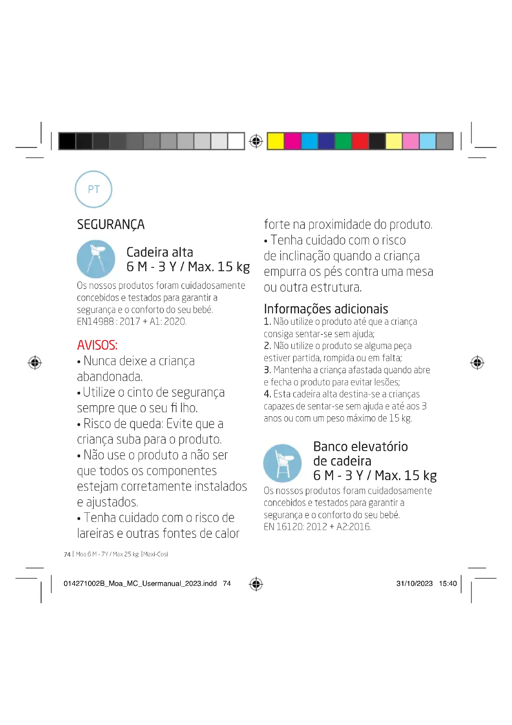 capazes de sentar-se sem ajuda e até aos 3 anos ou com um peso máximo de 15 kg. Banco elevatório de cadeira 6 M - 3 Y / Max. 15 kg Os nossos produtos foram cuidadosamente concebidos e testados para garantir a segurança e o conforto do seu bebé. EN 16120: 2012 + A2:2016.
