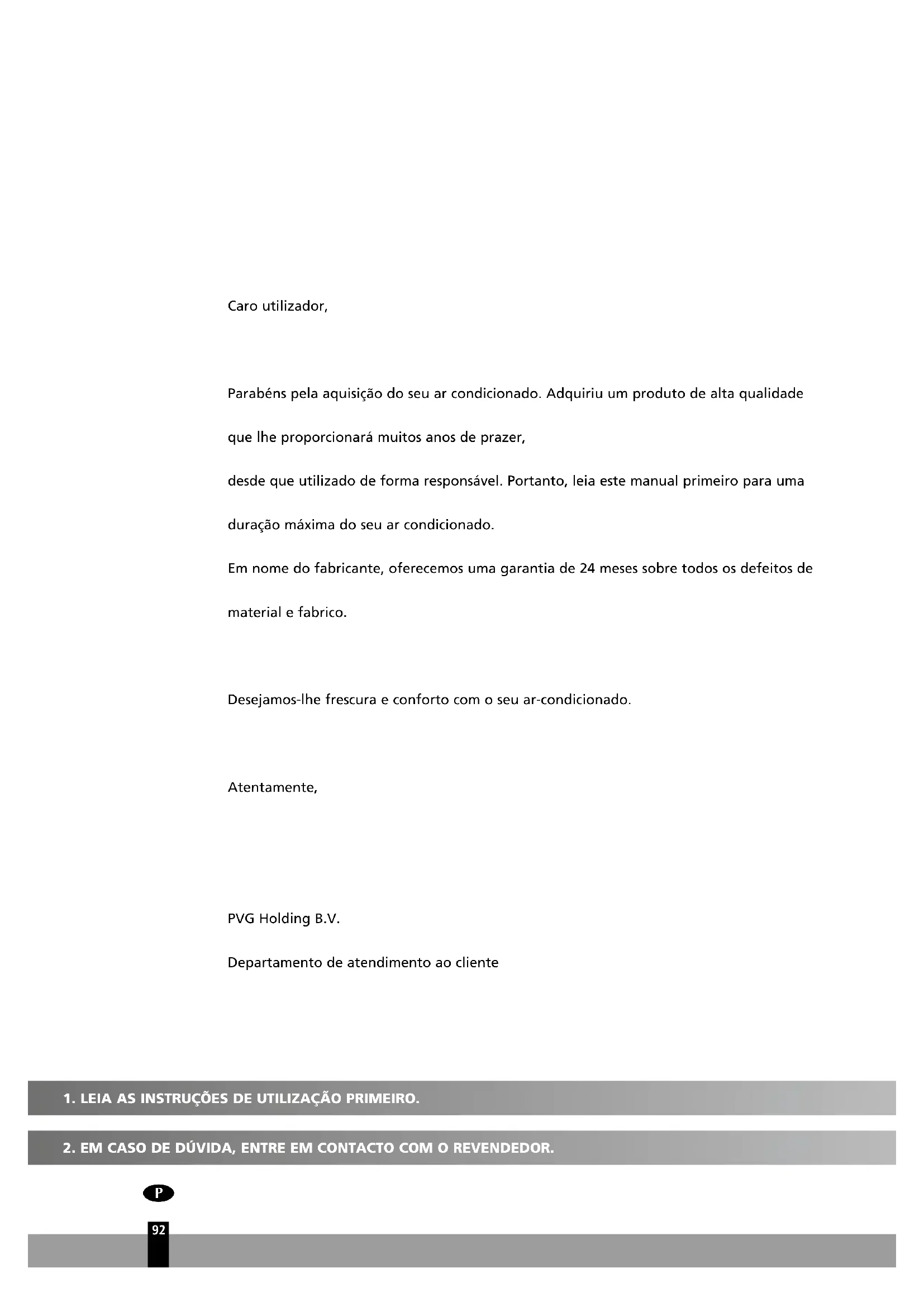 Internet: Om u nog beter van dienst te zijn kunt u de meest recente versie van de gebruikers-, installatie- en/of service handleiding downloaden op www.qlima.com.Caro utilizador, Parabéns pela aquisição do seu ar condicionado. Adquiriu um produto de alta qualidade que lhe proporcionará muitos anos de prazer, desde que utilizado de forma responsável. Portanto, leia este manual primeiro para uma duração máxima do seu ar condicionado. Em nome do fabricante, oferecemos uma garantia de 24 meses sobre todos os defeitos de material e fabrico. Desejamos-lhe frescura e conforto com o seu ar-condicionado. Atentamente, PVG Holding B.V. Departamento de atendimento ao cliente