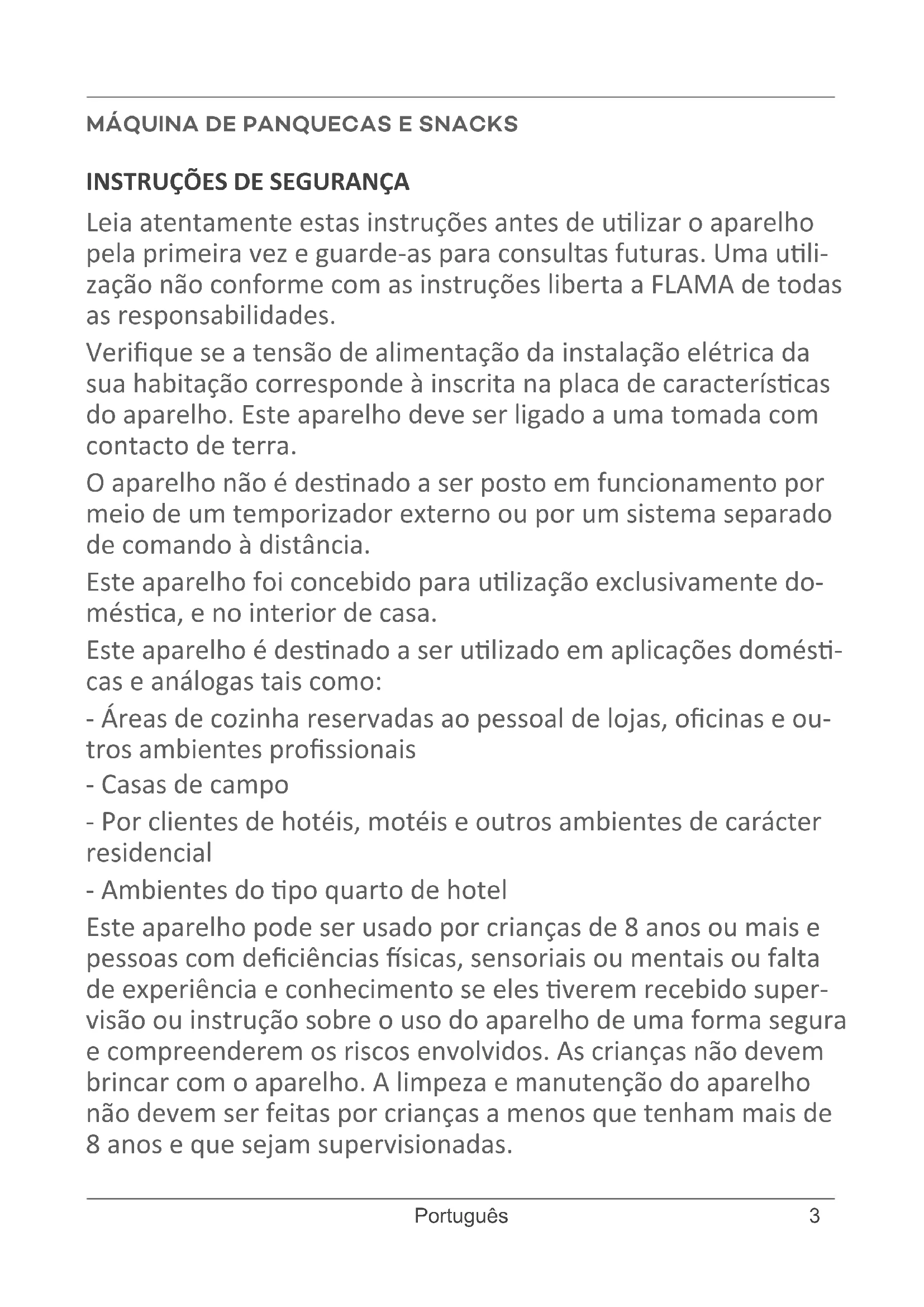 Leia atentamente estas instruções antes de ulizar o aparelho pela primeira vez e guarde-as para consultas futuras. Uma uli- zação não conforme com as instruções liberta a FLAMA de todas as responsabilidades. Verique se a tensão de alimentação da instalação elétrica da sua habitação corresponde à inscrita na placa de caracteríscas do aparelho. Este aparelho deve ser ligado a uma tomada com contacto de terra. O aparelho não é desnado a ser posto em funcionamento por meio de um temporizador externo ou por um sistema separado de comando à distância. Este aparelho foi concebido para ulização exclusivamente do- mésca, e no interior de casa. Este aparelho é desnado a ser ulizado em aplicações domés- cas e análogas tais como: - Áreas de cozinha reservadas ao pessoal de lojas, ocinas e ou- tros ambientes prossionais - Casas de campo - Por clientes de hotéis, motéis e outros ambientes de carácter residencial - Ambientes do po quarto de hotel Este aparelho pode ser usado por crianças de 8 anos ou mais e pessoas com deciências sicas, sensoriais ou mentais ou falta de experiência e conhecimento se eles verem recebido super- visão ou instrução sobre o uso do aparelho de uma forma segura e compreenderem os riscos envolvidos. As crianças não devem brincar com o aparelho. A limpeza e manutenção do aparelho não devem ser feitas por crianças a menos que tenham mais de 8 anos e que sejam supervisionadas. MÁQUINA DE PANQUECAS E SNACKS4 www.ama.pt Mantenha o aparelho e o cabo de alimentação fora do alcance das crianças menores de 8 anos. Aviso - A temperatura das supercies acessíveis poderá ser ele- vada quando o aparelho se encontra em funcionamento. Desligue o aparelho da alimentação removendo a cha da toma- da de corrente após cada ulização e aquando da limpeza. Deixe-o arrefecer antes de proceder a qualquer operação de lim- peza ou de arrumação. Antes de ligar o aparelho, cerque-se que o coloca numa su- percie plana, estável e horizontal. Não ulize o aparelho se o cabo de alimentação ou a cha se en- contrarem danicados, mande-os substuir imediatamente num Serviço de Assistência Técnica Autorizado FLAMA. Se o cabo de alimentação se danicar, deve ser substuído pelo fabricante, pelo seu serviço pós-venda ou pessoal de qualica- ção similar de forma a evitar um perigo. O aparelho nunca deve ser ulizado perto de materiais inamá- veis ou combusveis. Nunca deixe o aparelho sem vigilância. Não tape o aparelho durante o seu funcionamento. Não desmonte o aparelho. O aparelho só deve ser ulizado para cozinhar alimentos. A sua ulização para outros ns poderá provocar danos irreparáveis. Nunca mergulhe o aparelho em água ou qualquer outro líquido. AVISO: Carvão ou outros combusveis não devem ser ulizados com este aparelho. Este produto cumpre as Direvas de Compabilidade Eletro- magnéca e de Baixa Tensão. Este manual de instruções também está disponível no formato PDF em www.ama.pt.5 Português DESCRIÇÃO