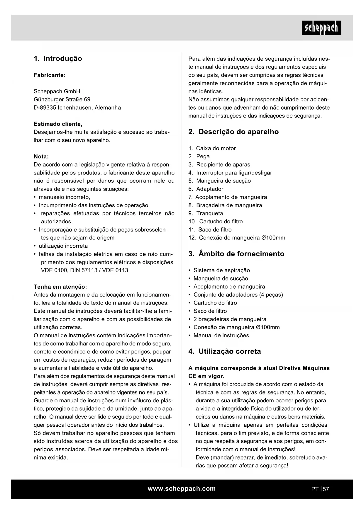 Tenha em atenção: Antes da montagem e da colocação em funcionamen- to, leia a totalidade do texto do manual de instruções. Este manual de instruções deverá facilitar-lhe a fami- liarização com o aparelho e com as possibilidades de utilização corretas. O manual de instruções contém indicações importan- tes de como trabalhar com o aparelho de modo seguro, correto e económico e de como evitar perigos, poupar em custos de reparação, reduzir períodos de paragem e aumentar a abilidade e vida útil do aparelho. Para além dos regulamentos de segurança deste manual de instruções, deverá cumprir sempre as diretivas res- peitantes à operação do aparelho vigentes no seu país. Guarde o manual de instruções num invólucro de plás- tico, protegido da sujidade e da umidade, junto ao apa- relho. O manual deve ser lido e seguido por todo e qual- quer pessoal operador antes do início dos trabalhos. Só devem trabalhar no aparelho pessoas que tenham sido instruídas acerca da utilização do aparelho e dos perigos associados. Deve ser respeitada a idade mí- nima exigida.www.scheppach.com