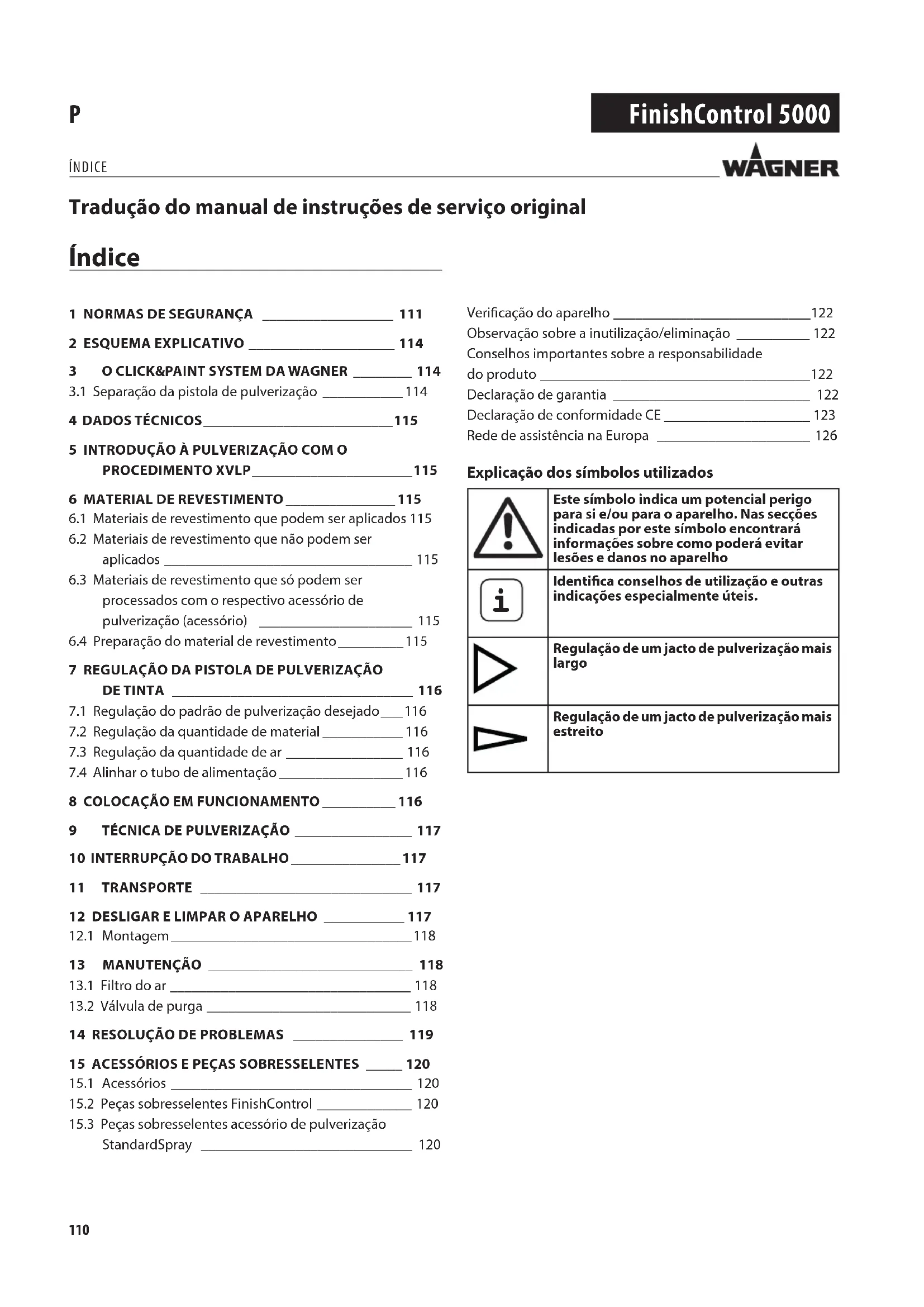 Identica conselhos de utilização e outras indicações especialmente úteis.Regulação de um jacto de pulverização mais largoRegulação de um jacto de pulverização mais estreito Tradução do manual de instruções de serviço original111 FinishControl 5000
