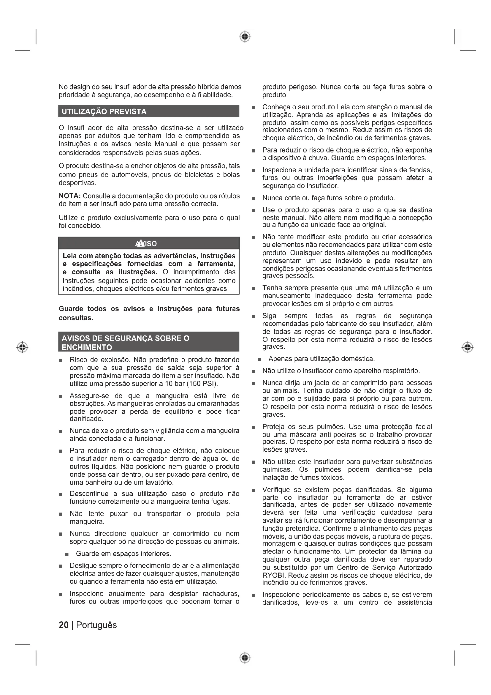 ENCHIMENTO ■ Risco de explosão. Não predefine o produto fazendo com que a sua pressão de saída seja superior à pressão máxima marcada do item a ser insuflado. Não utilize uma pressão superior a 10 bar (150 PSI). ■ Assegure-se de que a mangueira está livre de obstruções. As mangueiras enroladas ou emaranhadas pode provocar a perda de equilíbrio e pode ficar danificado. ■ Nunca deixe o produto sem vigilância com a mangueira ainda conectada e a funcionar. ■ Para reduzir o risco de choque elétrico, não coloque o insuflador nem o carregador dentro de água ou de outros líquidos. Não posicione nem guarde o produto onde possa cair dentro, ou ser puxado para dentro, de uma banheira ou de um lavatório. ■ Descontinue a sua utilização caso o produto não funcione corretamente ou a mangueira tenha fugas. ■ Não tente puxar ou transportar o produto pela mangueira. ■ Nunca direccione qualquer ar comprimido ou nem sopre qualquer pó na direcção de pessoas ou animais. ■ Guarde em espaços interiores. ■ Desligue sempre o fornecimento de ar e a alimentação eléctrica antes de fazer quaisquer ajustes, manutenção ou quando a ferramenta não está em utilização. ■ Inspecione anualmente para despistar rachaduras, furos ou outras imperfeições que poderiam tornar o produto perigoso. Nunca corte ou faça furos sobre o produto. ■ Conheça o seu produto Leia com atenção o manual de utilização. Aprenda as aplicações e as limitações do produto, assim como os possíveis perigos específicos relacionados com o mesmo. Reduz assim os riscos de choque eléctrico, de incêndio ou de ferimentos graves. ■ Para reduzir o risco de choque eléctrico, não exponha o dispositivo à chuva. Guarde em espaços interiores. ■ Inspecione a unidade para identificar sinais de fendas, furos ou outras imperfeições que possam afetar a segurança do insuflador. ■ Nunca corte ou faça furos sobre o produto. ■ Use o produto apenas para o uso a que se destina neste manual. Não altere nem modifique a concepção ou a função da unidade face ao original. ■ Não tente modificar este produto ou criar acessórios ou elementos não recomendados para utilizar com este produto. Quaisquer destas alterações ou modificações representam um uso indevido e pode resultar em condições perigosas ocasionando eventuais ferimentos graves pessoais. ■ Tenha sempre presente que uma má utilização e um manuseamento inadequado desta ferramenta pode provocar lesões em si próprio e em outros. ■ Siga sempre todas as regras de segurança recomendadas pelo fabricante do seu insuflador, além de todas as regras de segurança para o insuflador. O respeito por esta norma reduzirá o risco de lesões graves. ■ Apenas para utilização doméstica. ■ Não utilize o insuflador como aparelho respiratório. ■ Nunca dirija um jacto de ar comprimido para pessoas ou animais. Tenha cuidado de não dirigir o fluxo de ar com pó e sujidade para si próprio ou para outrem. O respeito por esta norma reduzirá o risco de lesões graves. ■ Proteja os seus pulmões. Use uma protecção facial ou uma máscara anti-poeiras se o trabalho provocar poeiras. O respeito por esta norma reduzirá o risco de lesões graves. ■ Não utilize este insuflador para pulverizar substâncias químicas. Os pulmões podem danificar-se pela inalação de fumos tóxicos. ■ Verifique se existem peças danificadas. Se alguma parte do insuflador ou ferramenta de ar estiver danificada, antes de poder ser utilizado novamente deverá ser feita uma verificação cuidadosa para avaliar se irá funcionar corretamente e desempenhar a função pretendida. Confirme o alinhamento das peças móveis, a união das peças móveis, a ruptura de peças, montagem e quaisquer outras condições que possam afectar o funcionamento. Um protector da lâmina ou qualquer outra peça danificada deve ser reparado ou substituído por um Centro de Serviço Autorizado RYOBI. Reduz assim os riscos de choque eléctrico, de incêndio ou de ferimentos graves. ■ Inspeccione periodicamente os cabos e, se estiverem danificados, leve-os a um centro de assistência21 Português |