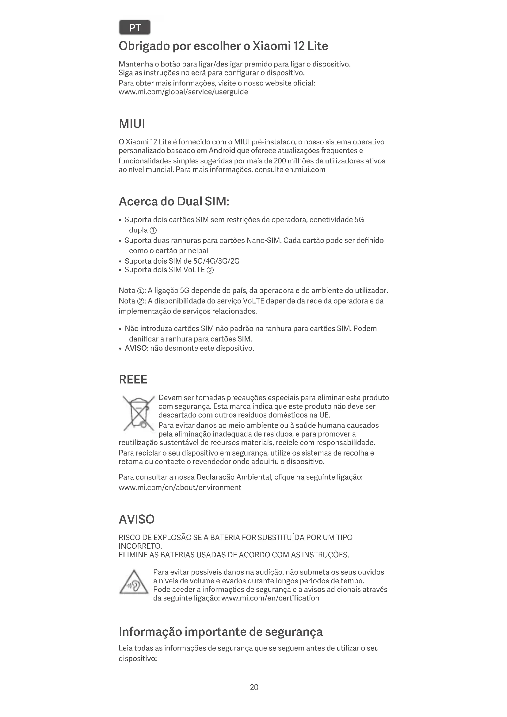 - AVISO: não desmonte este dispositivo. REEE Devem ser tomadas precauções especiais para eliminar este produto com segurança. Esta marca indica que este produto não deve ser descartado com outros resíduos domésticos na UE. Para evitar danos ao meio ambiente ou à saúde humana causados pela eliminação inadequada de resíduos, e para promover a reutilização sustentável de recursos materiais, recicle com responsabilidade. Para reciclar o seu dispositivo em segurança, utilize os sistemas de recolha e retoma ou contacte o revendedor onde adquiriu o dispositivo. Para consultar a nossa Declaração Ambiental, clique na seguinte ligação: www.mi.com/en/about/environment AVISO RISCO DE EXPLOSÃO SE A BATERIA FOR SUBSTITUÍDA POR UM TIPO INCORRETO. ELIMINE AS BATERIAS USADAS DE ACORDO COM AS INSTRUÇÕES. Para evitar possíveis danos na audição, não submeta os seus ouvidos a níveis de volume elevados durante longos períodos de tempo. Pode aceder a informações de segurança e a avisos adicionais através da seguinte ligação: www.mi.com/en/certification Informação importante de segurança Leia todas as informações de segurança que se seguem antes de utilizar o seu dispositivo: 20• Utilizar cabos, transformadores ou baterias não autorizados pode provocar incêndios, explosões ou outros riscos.