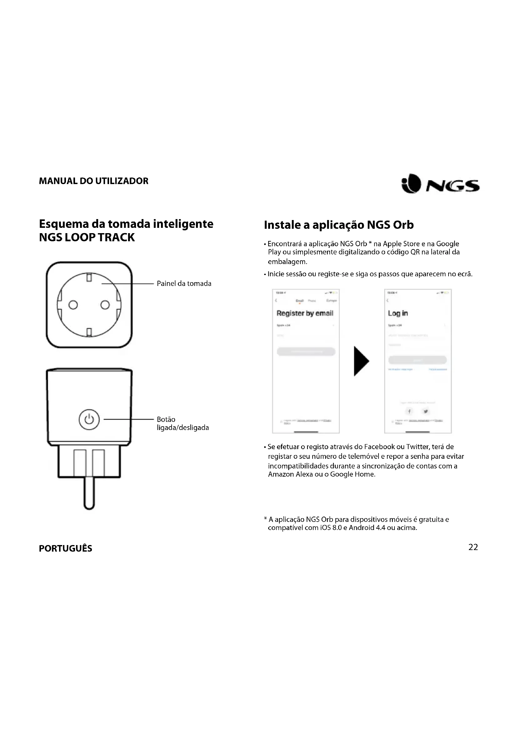 - SeefetuaroregistoatravésdoFacebookouTwitter,teráde registaroseunúmerodetelemóvelereporasenhaparaevitar incompatibilidadesduranteasincronizaçãodecontascoma AmazonAlexaouoGoogleHome. *AaplicaçãoNGSOrbparadispositivosmóveiségratuitae compatívelcomiOS8.0eAndroid4.4ouacima.PORTUGUÊS