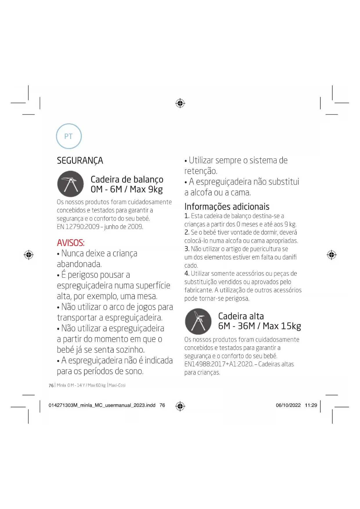 Maxi-Cosi SEGURANÇA Cadeira de balanço 0M - 6M / Max 9kg Os nossos produtos foram cuidadosamente concebidos e testados para garantir a segurança e o conforto do seu bebé. EN 12790:2009 – junho de 2009. AVISOS: