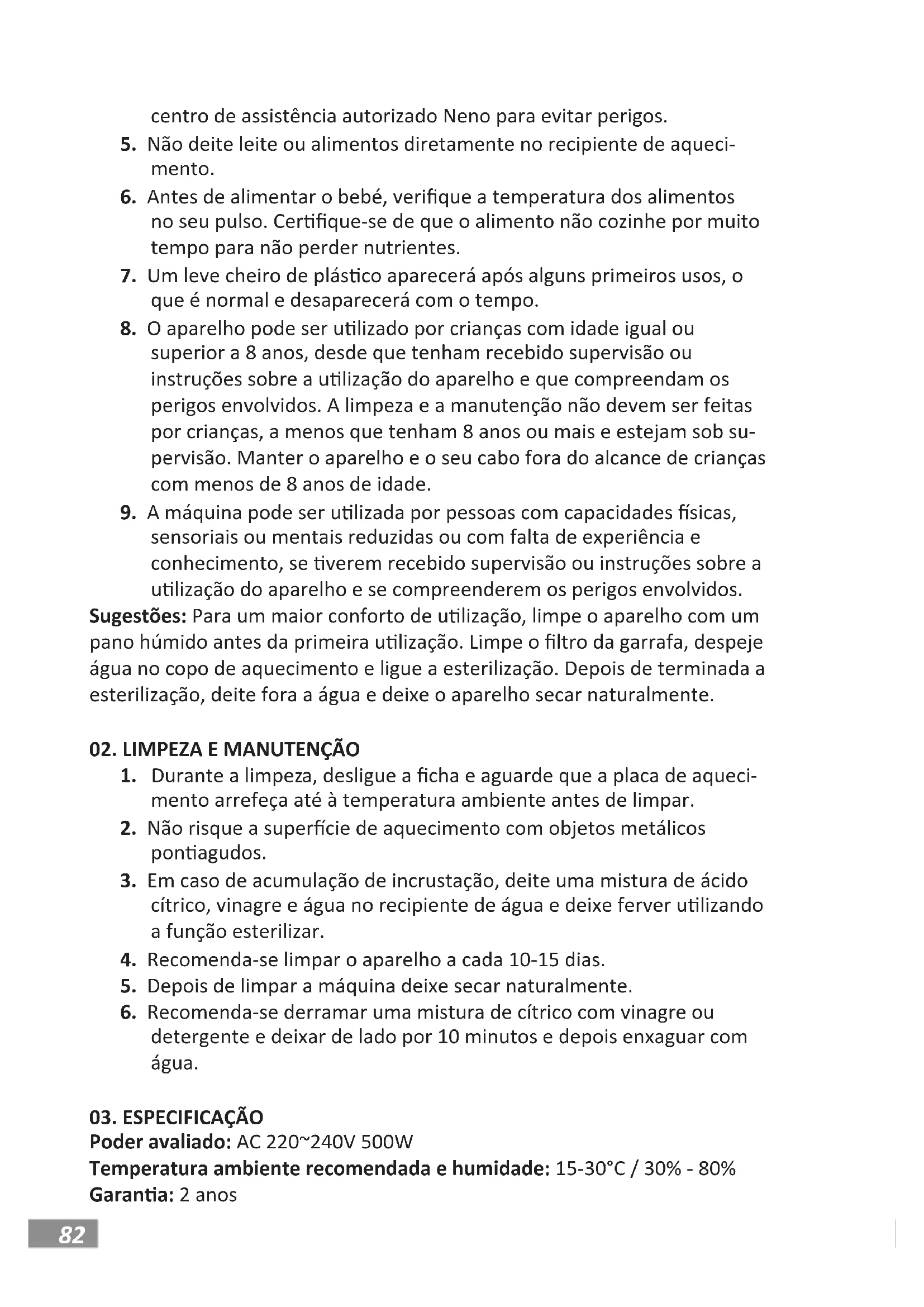 sensoriais ou mentais reduzidas ou com falta de experiência e conhecimento, se verem recebido supervisão ou instruções sobre a ulização do aparelho e se compreenderem os perigos envolvidos. Sugestões: Para um maior conforto de ulização, limpe o aparelho com um pano húmido antes da primeira ulização. Limpe o ltro da garrafa, despeje água no copo de aquecimento e ligue a esterilização. Depois de terminada a esterilização, deite fora a água e deixe o aparelho secar naturalmente.