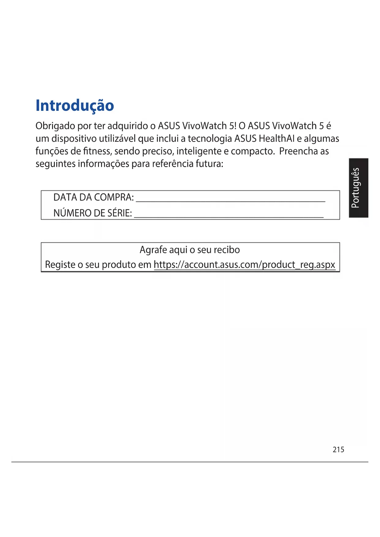 Buscar actualización para comprobar si su versión actual es la más reciente.214 Español215 Português Introdução Obrigado por ter adquirido o ASUS VivoWatch 5! O ASUS VivoWatch 5 é um dispositivo utilizável que inclui a tecnologia ASUS HealthAI e algumas funções de tness, sendo preciso, inteligente e compacto. Preencha as seguintes informações para referência futura: