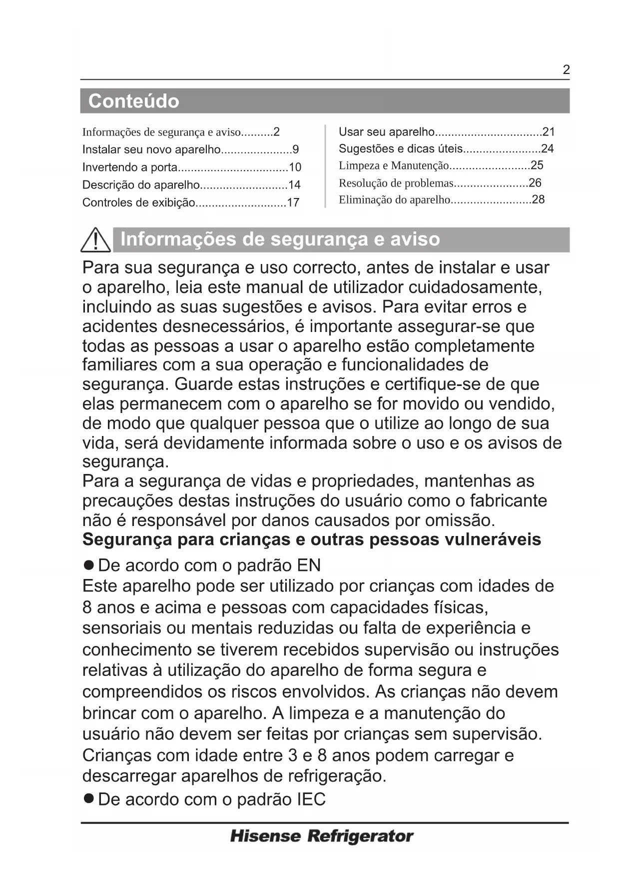 - Eliminação do aparelho Informações de segurança e aviso Para sua segurança e uso correcto, antes de instalar e usar o aparelho, leia este manual de utilizador cuidadosamente, incluindo as suas sugestões e avisos. Para evitar erros e acidentes desnecessários, é importante assegurar-se que todas as pessoas a usar o aparelho estão completamente familiares com a sua operação e funcionalidades de segurança. Guarde estas instruções e certifique-se de que elas permanecem com o aparelho se for movido ou vendido, de modo que qualquer pessoa que o utilize ao longo de sua vida, será devidamente informada sobre o uso e os avisos de segurança. Para a segurança de vidas e propriedades, mantenhas as precauções destas instruções do usuário como o fabricante não é responsável por danos causados por omissão. Segurança para crianças e outras pessoas vulneráveis p. 28