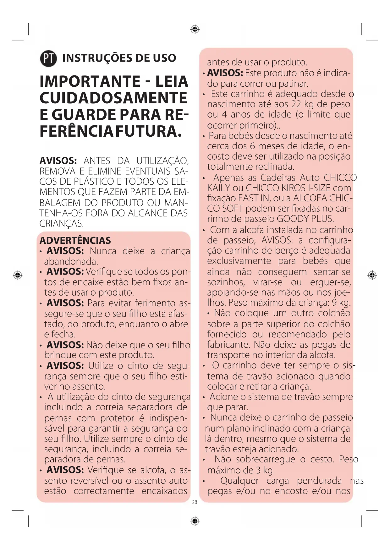 - Apenas as Cadeiras Auto CHICCO KAILY ou CHICCO KIROS I-SIZE com xação FAST IN, ou a ALCOFA CHIC- CO SOFT podem ser xadas no car- rinho de passeio GOODY PLUS.