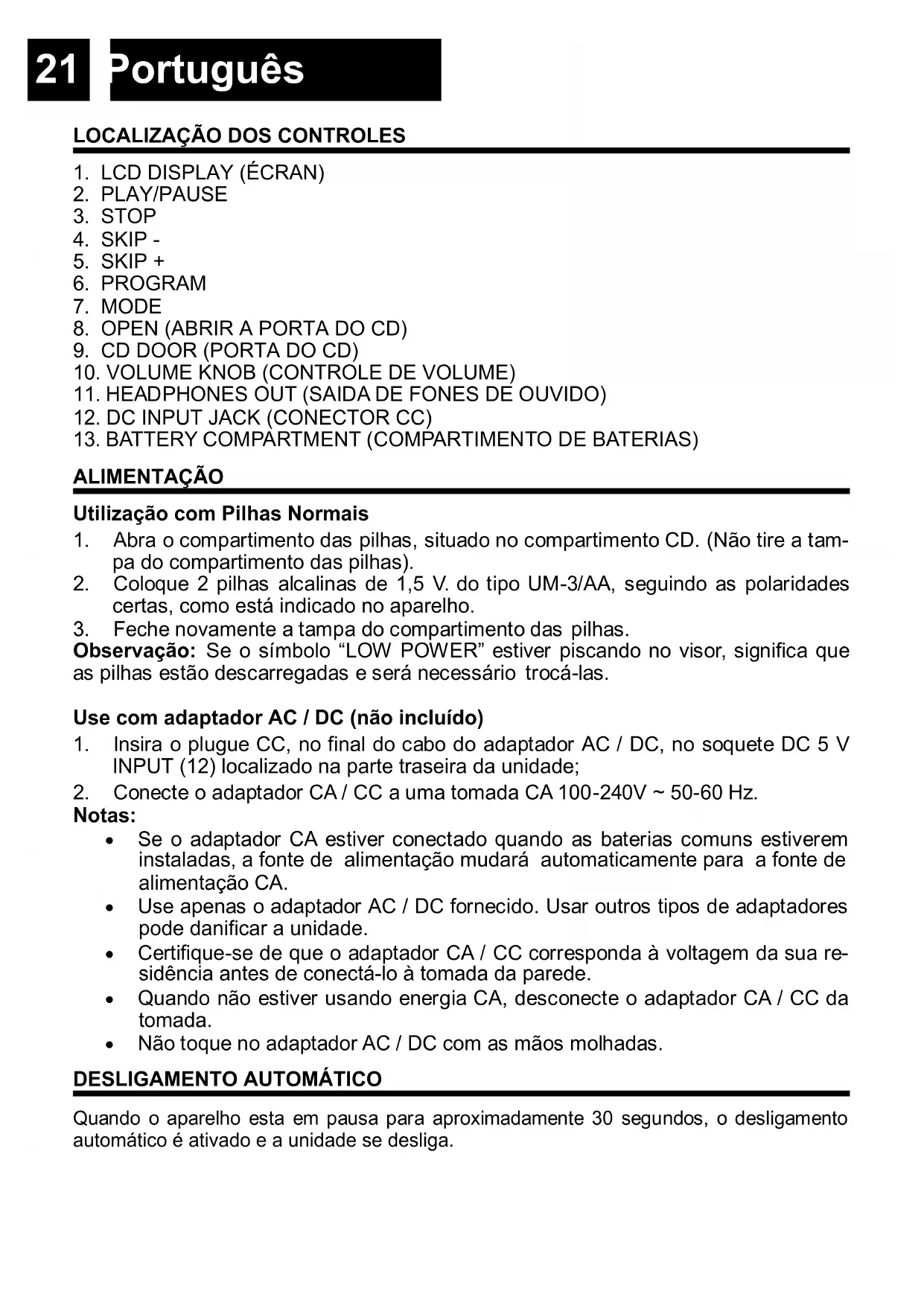 Quando o aparelho esta em pausa para aproximadamente 30 segundos, o desligamento automático é ativado e a unidade se desliga.22 Português