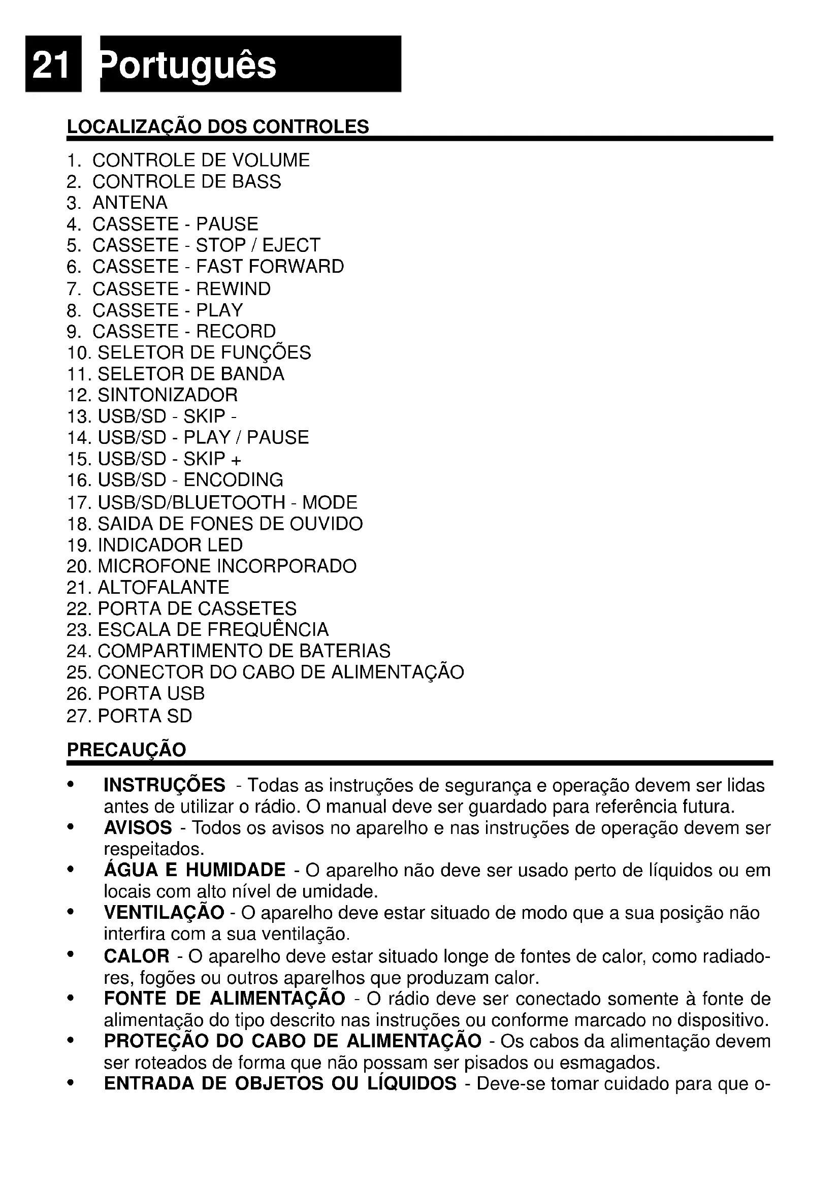SERVIÇO - O usuário não deve tentar reparar o aparelho além do descrito nas instruções. Toda a manutenção deve ser feita para pessoal qualificado. Nota: Se o ècran não funciona corretamente ou não reage à operação de qualquer controle pode ser devido à descarga eletrostática. Desligue, desconecte o cabo de alimentação e remova todas as baterias. Ligue-o novamente após alguns segundos. ALIMENTAÇÃO ALIMENTAÇÃO CA: Você pode alimentar o seu sistema estéreo portátil conectando o cabo de alimentação CA ao conector (25) e em uma tomada CA de parede. Verifique que a voltagem nominal do seu aparelho corresponde à sua voltagem local. Certifique-se de que o cabo CA esteja totalmente inserido no aparelho. ALIMENTAÇÃO COM BATERIAS: Para usar o rádio com baterias, desconecte o cabo de alimentação CA e insira 4 baterias “LR20” no compartimento (24). Verifique que as baterias estejam inseridas corretam. para evitar danos ao aparelho. Remova as baterias quando não vai usar o rádio por um longo período de tempo, pois isso causará vazamento às baterias e, consequentemente, danos ao seu rádio.