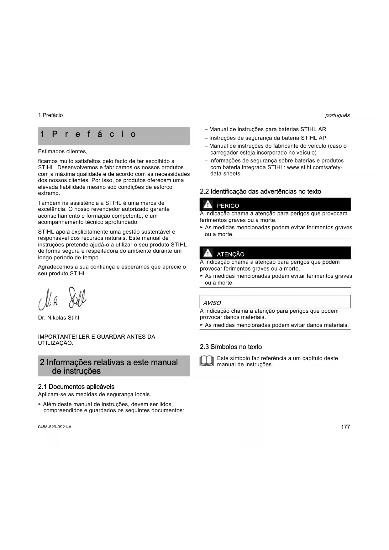 português 1 Prefácio Estimados clientes, ficamos muito satisfeitos pelo facto de ter escolhido a STIHL. Desenvolvemos e fabricamos os nossos produtos com a máxima qualidade e de acordo com as necessidades dos nossos clientes. Por isso, os produtos oferecem uma elevada fiabilidade mesmo sob condições de esforço extremo. Também na assistência a STIHL é uma marca de excelência. O nosso revendedor autorizado garante aconselhamento e formação competente, e um acompanhamento técnico aprofundado. STIHL apoia explicitamente uma gestão sustentável e responsável dos recursos naturais. Este manual de instruções pretende ajudá-o a utilizar o seu produto STIHL de forma segura e respeitadora do ambiente durante um longo período de tempo. Agradecemos a sua confiança e esperamos que aprecie o seu produto STIHL. Dr. Nikolas Stihl