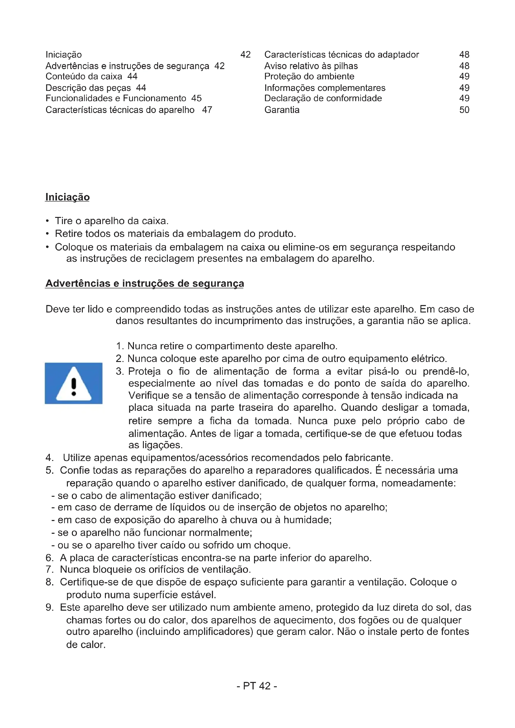 chamas fortes ou do calor, dos aparelhos de aquecimento, dos fogões ou de qualquer outro aparelho (incluindo amplicadores) que geram calor. Não o inale perto de fontes de calor. Iniciação 42 Advertências e instruções de segurança 42 Conteúdo da caixa 44 Descrição das peças 44 Funcionalidades e Funcionamento 45 Características técnicas do aparelho 47 Características técnicas do adaptador 48 Aviso relativo às pilhas 48 Proteção do ambiente 49 Informações complementares 49 Declaração de conformidade 49 Garantia 50- PT 43 -