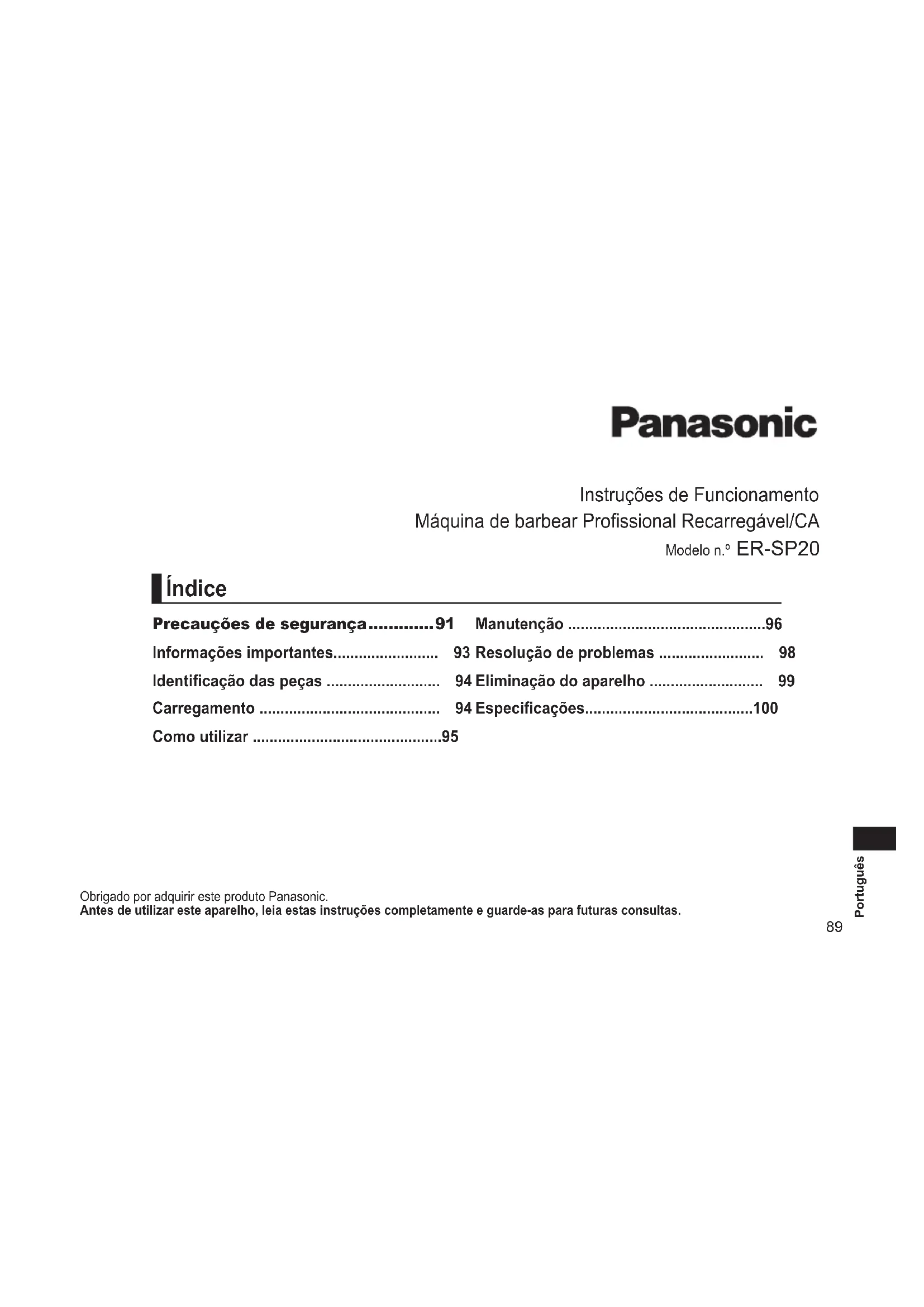 - Paraproteçãoambientalereciclagemdosmateriais Este aparelho contém uma bateria de iões de lítio. Certique-se de que a bateria é eliminada num local designado ocialmente, se existir um no seu país.100 Português Especicações Fonte de alimentação Veja a placa identicativa no transformador de CA. (Conversão automática de voltagem) Voltagem do motor 3,6 V Tempo de carregamento Aprox. 1 hora Pode consultar mais informações sobre a eciência energética do produto no nosso website, www.panasonic.com, introduzindo o número de modelo no ecrã de pesquisa. EliminaçãodeEquipamentosUsadoseBaterias ApenasparaaUniãoEuropeiaepaísescomsistemasdereciclagem Estes símbolos nos produtos, embalagens, e/ou documentos que os acompanham indicam que os produtos elétricos e eletrónicos e as baterias usados não podem ser misturados com os resíduos urbanos indiferenciados. Para um tratamento adequado, reutilização e reciclagem de produtos e baterias usados, solicitamos que os coloque em pontos de recolha próprios, em conformidade com a respetiva legislação nacional. Ao eliminar estes produtos corretamente estará a ajudar a poupar recursos valiosos e a prevenir quaisquer potenciais efeitos negativos sobre o ambiente e a saúde humana. Para mais informações acerca da recolha e reciclagem, por favor contacte a sua autarquia local. De acordo com a legislação nacional podem ser aplicadas contraordenações pela eliminação incorreta destes resíduos. Nota para o símbolo da bateria (símbolo na parte inferior) Este símbolo pode ser utilizado conjuntamente com um símbolo químico. Neste caso estará em conformidade com o estabelecido na Diretiva referente aos produtos químicos em causa. Importador: Panasonic Marketing Europe GmbH Representante Autorizado na UE: Panasonic Testing Centre Winsbergring 15, 22525 Hamburgo, Alemanha Fabricado por: Panasonic Corporation 1006, Oaza Kadoma, Cidade de Kadoma, Osaca, Japão101 Norsk Brukerinstruksjoner Oppladbar barbermaskin for profesjonell bruk Modellnr. ER‑SP20 Takk for at du har kjøpt dette Panasonic‑produktet. Førdubegynneråbrukeproduktetbervideglesegodtigjennomdenneinformasjonenogtavarepådenforsenerebruk. Sikkerhetsforholdsregler p. 103