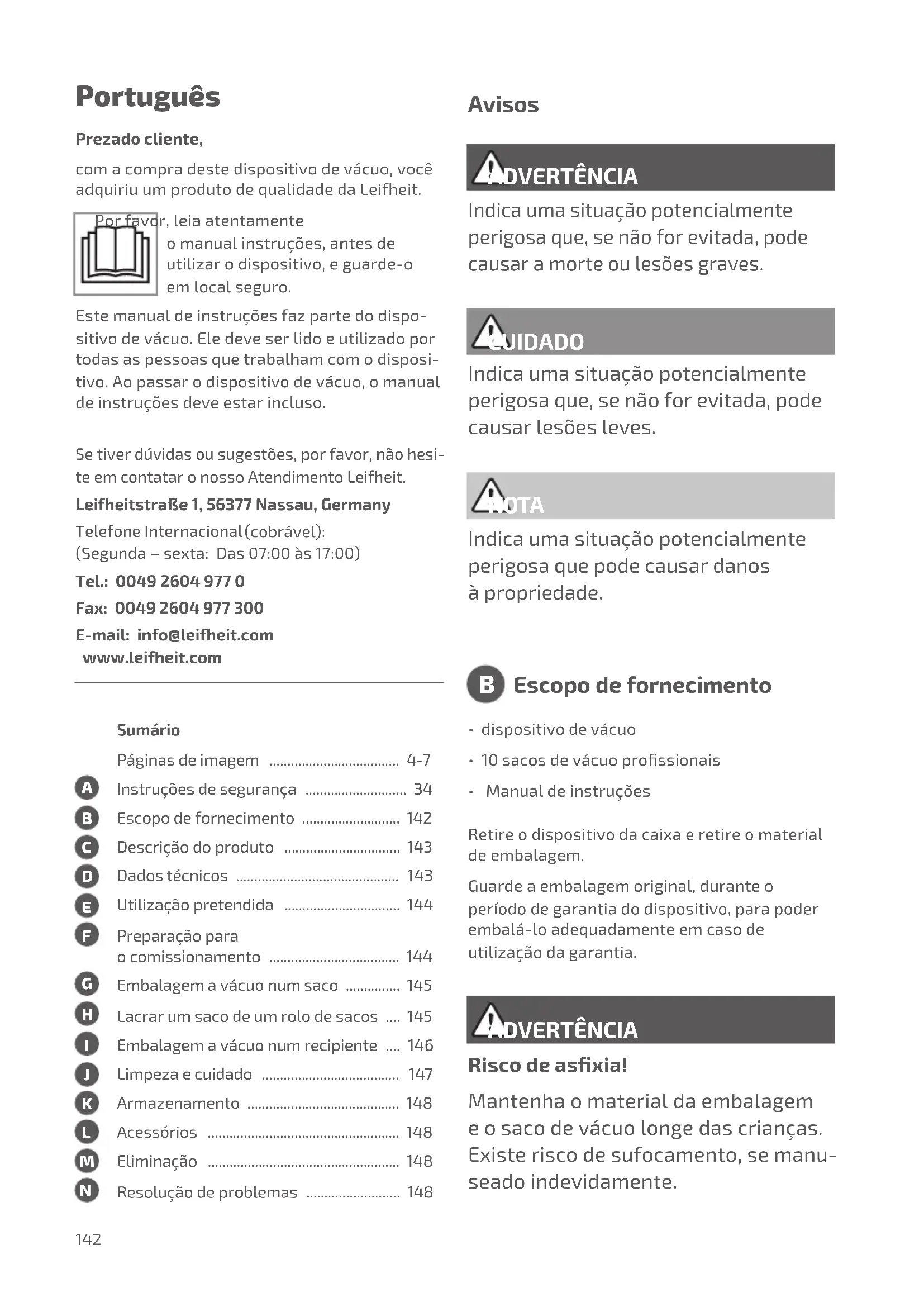 - Asiguraţi-vă că marginea recipientului este sucient de curată. Dacă toate situaţiile menţionate mai sus sunt excluse, vă rugăm să vă adresaţi punctului de service indicat. RO142 Sumário Páginas de imagem .................................... 4-7 Instruções de segurança ............................ 34 Escopo de fornecimento ........................... 142 Descrição do produto ................................ 143 Dados técnicos ............................................. 143 Utilização pretendida ................................ 144 Preparação para o comissionamento .................................... 144 Embalagem a vácuo num saco ............... 145 Lacrar um saco de um rolo de sacos .... 145 Embalagem a vácuo num recipiente .... 146 Limpeza e cuidado ...................................... 147 Armazenamento .......................................... 148 Acessórios ..................................................... 148 Eliminação ..................................................... 148 Resolução de problemas .......................... 148 Português Prezado cliente, com a compra deste dispositivo de vácuo, você adquiriu um produto de qualidade da Leifheit. Por favor, leia atentamente o manual instruções, antes de utilizar o dispositivo, e guarde-o em local seguro. Este manual de instruções faz parte do dispo- sitivo de vácuo. Ele deve ser lido e utilizado por todas as pessoas que trabalham com o disposi- tivo. Ao passar o dispositivo de vácuo, o manual de instruções deve estar incluso. ADVERTÊNCIA ADVERTÊNCIA Avisos Indica uma situação potencialmente perigosa que, se não for evitada, pode causar a morte ou lesões graves. Risco de asxia! Mantenha o material da embalagem e o saco de vácuo longe das crianças. Existe risco de sufocamento, se manu- seado indevidamente.