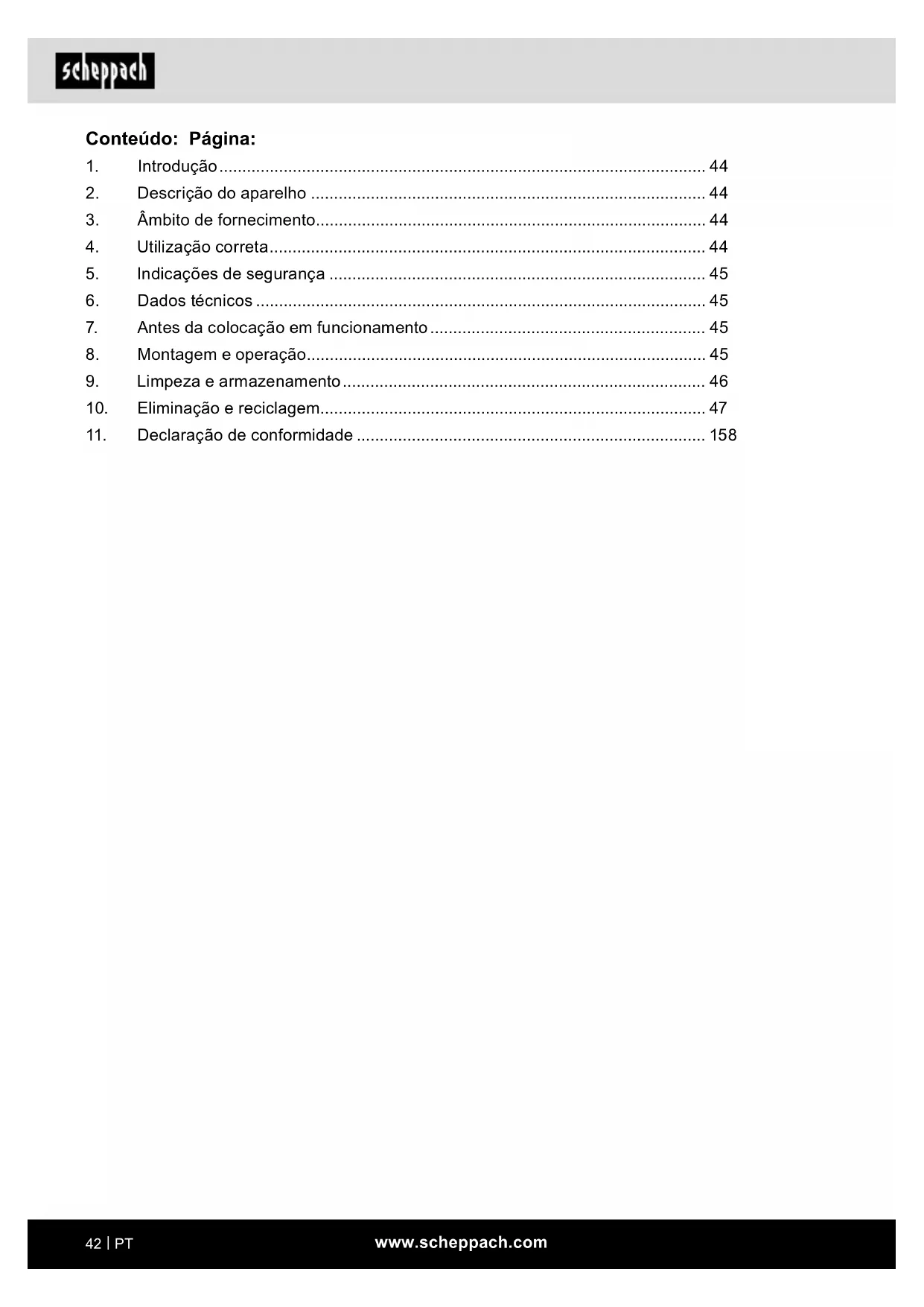 Fabricante: Scheppach GmbH Günzburger Straße 69 D-89335 Ichenhausen Estimado cliente, Desejamos-lhe muita satisfação e sucesso ao traba- lhar com o seu novo aparelho. Nota: De acordo com a legislação vigente relativa à respon- sabilidade pelos produtos, o fabricante deste aparelho não é responsável por danos que ocorram nele ou através dele nas seguintes situações: