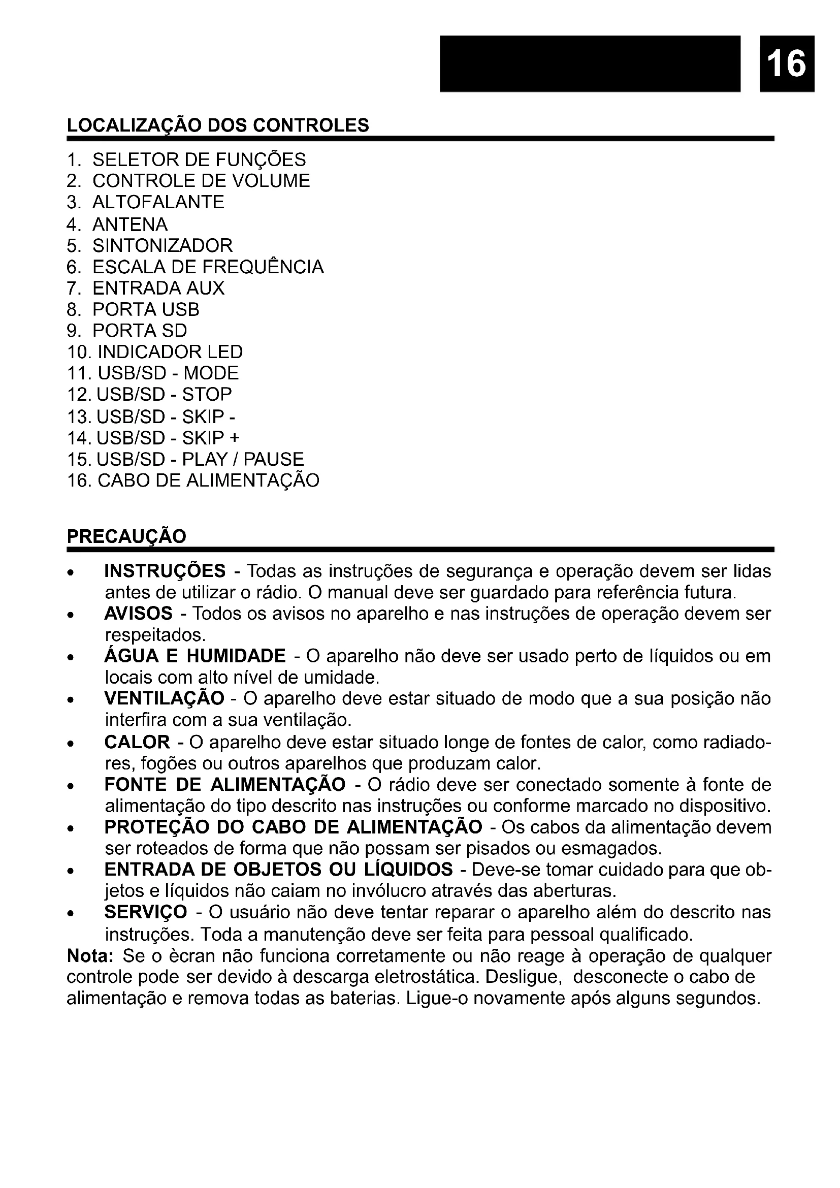 PRECAUÇÃO INSTRUÇÕES - Todas as instruções de segurança e operação devem ser lidas antes de utilizar o rádio. O manual deve ser guardado para referência futura. AVISOS - Todos os avisos no aparelho e nas instruções de operação devem ser respeitados. ÁGUA E HUMIDADE - O aparelho não deve ser usado perto de líquidos ou em locais com alto nível de umidade. VENTILAÇÃO - O aparelho deve estar situado de modo que a sua posição não interfira com a sua ventilação. CALOR - O aparelho deve estar situado longe de fontes de calor, como radiado- res, fogões ou outros aparelhos que produzam calor. FONTE DE ALIMENTAÇÃO - O rádio deve ser conectado somente à fonte de alimentação do tipo descrito nas instruções ou conforme marcado no dispositivo. PROTEÇÃO DO CABO DE ALIMENTAÇÃO - Os cabos da alimentação devem ser roteados de forma que não possam ser pisados ou esmagados. ENTRADA DE OBJETOS OU LÍQUIDOS - Deve-se tomar cuidado para que ob- jetos e líquidos não caiam no invólucro através das aberturas. SERVIÇO - O usuário não deve tentar reparar o aparelho além do descrito nas instruções. Toda a manutenção deve ser feita para pessoal qualificado. Nota: Se o ècran não funciona corretamente ou não reage à operação de qualquer controle pode ser devido à descarga eletrostática. Desligue, desconecte o cabo de alimentação e remova todas as baterias. Ligue-o novamente após alguns segundos.17 Português ALIMENTAÇÃO ALIMENTAÇÃO CA: Para alimentar o seu radio, conecta o cabo de alimentação CA em uma tomada CA de parede. Verifique que a voltagem nominal do seu aparelho corresponde à sua voltagem local.
