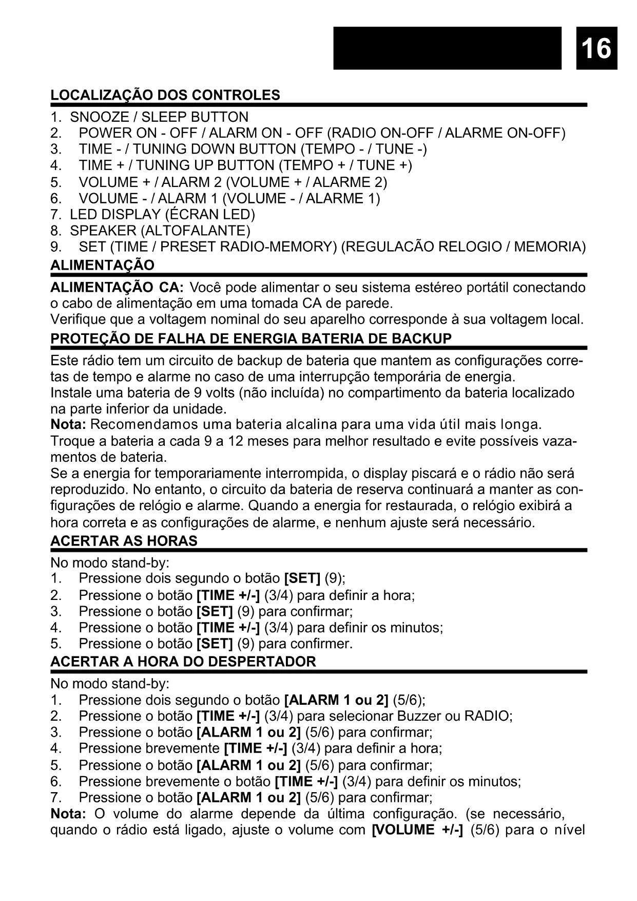 ALIMENTAÇÃO ALIMENTAÇÃO CA: Você pode alimentar o seu sistema estéreo portátil conectando o cabo de alimentação em uma tomada CA de parede. Verifique que a voltagem nominal do seu aparelho corresponde à sua voltagem local. PROTEÇÃO DE FALHA DE ENERGIA BATERIA DE BACKUP Este rádio tem um circuito de backup de bateria que mantem as configurações corre- tas de tempo e alarme no caso de uma interrupção temporária de energia. Instale uma bateria de 9 volts (não incluída) no compartimento da bateria localizado na parte inferior da unidade. Nota: Recomendamos uma bateria alcalina para uma vida útil mais longa. Troque a bateria a cada 9 a 12 meses para melhor resultado e evite possíveis vaza- mentos de bateria. Se a energia for temporariamente interrompida, o display piscará e o rádio não será reproduzido. No entanto, o circuito da bateria de reserva continuará a manter as con- figurações de relógio e alarme. Quando a energia for restaurada, o relógio exibirá a hora correta e as configurações de alarme, e nenhum ajuste será necessário.