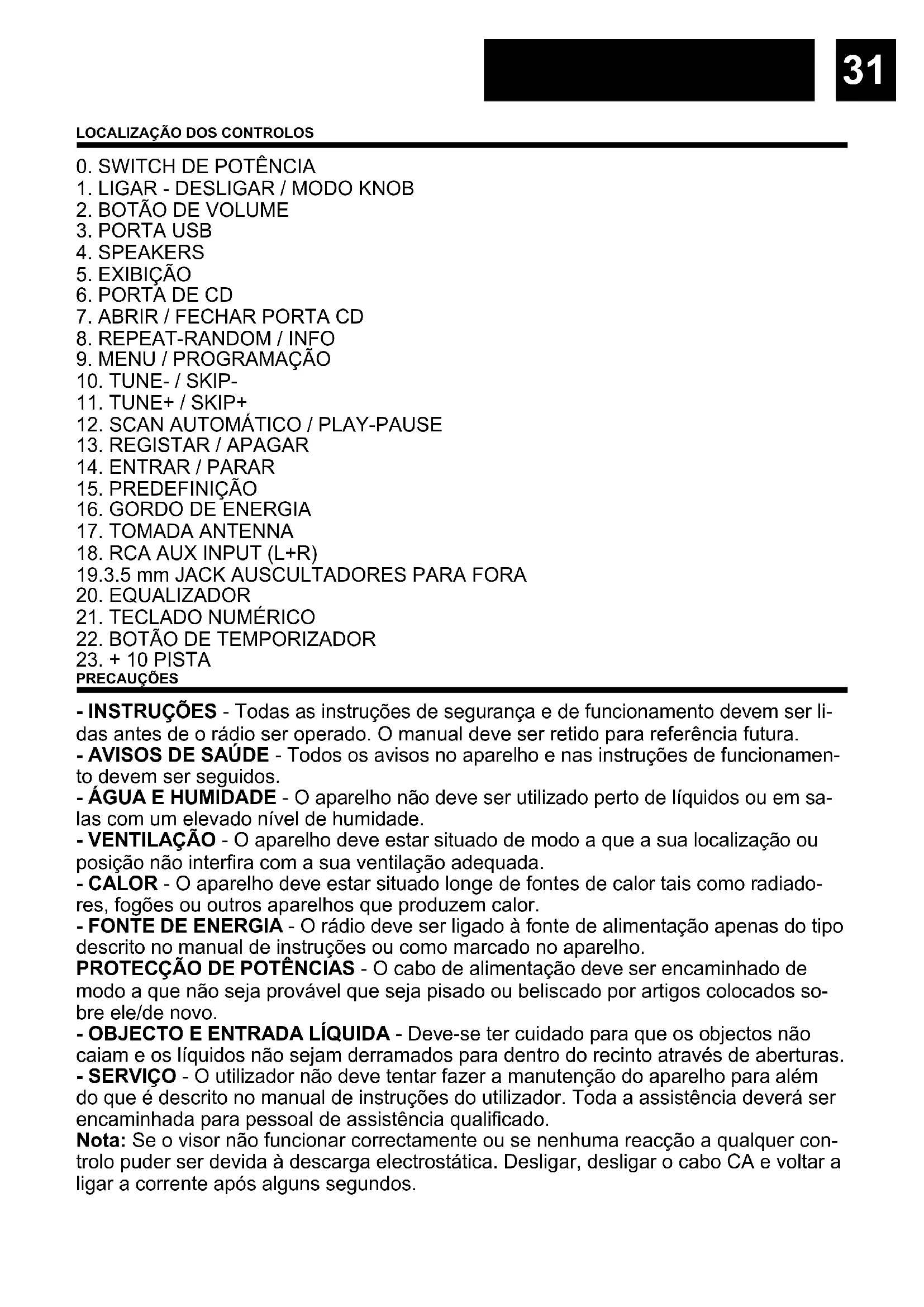 PRECAUÇÕES - INSTRUÇÕES - Todas as instruções de segurança e de funcionamento devem ser li- das antes de o rádio ser operado. O manual deve ser retido para referência futura. - AVISOS DE SAÚDE - Todos os avisos no aparelho e nas instruções de funcionamen- to devem ser seguidos. - ÁGUA E HUMIDADE - O aparelho não deve ser utilizado perto de líquidos ou em sa- las com um elevado nível de humidade. - VENTILAÇÃO - O aparelho deve estar situado de modo a que a sua localização ou posição não interfira com a sua ventilação adequada. - CALOR - O aparelho deve estar situado longe de fontes de calor tais como radiado- res, fogões ou outros aparelhos que produzem calor. - FONTE DE ENERGIA - O rádio deve ser ligado à fonte de alimentação apenas do tipo descrito no manual de instruções ou como marcado no aparelho. PROTECÇÃO DE POTÊNCIAS - O cabo de alimentação deve ser encaminhado de modo a que não seja provável que seja pisado ou beliscado por artigos colocados so- bre ele/de novo. - OBJECTO E ENTRADA LÍQUIDA - Deve-se ter cuidado para que os objectos não caiam e os líquidos não sejam derramados para dentro do recinto através de aberturas. - SERVIÇO - O utilizador não deve tentar fazer a manutenção do aparelho para além do que é descrito no manual de instruções do utilizador. Toda a assistência deverá ser encaminhada para pessoal de assistência qualificado. Nota: Se o visor não funcionar correctamente ou se nenhuma reacção a qualquer con- trolo puder ser devida à descarga electrostática. Desligar, desligar o cabo CA e voltar a ligar a corrente após alguns segundos.32 Português