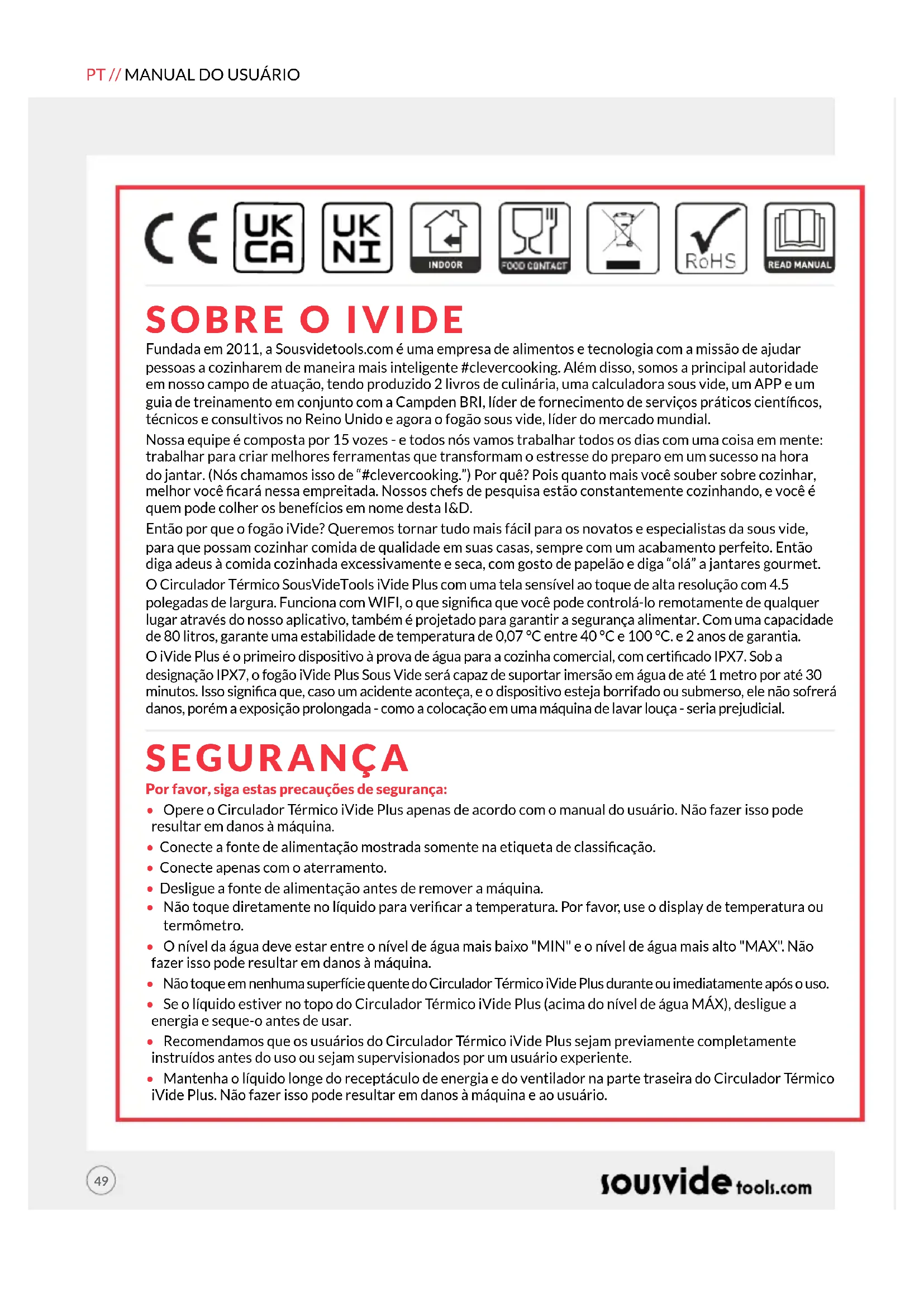 SEGURANÇA Fundada em 2011, a Sousvidetools.com é uma empresa de alimentos e tecnologia com a missão de ajudar pessoas a cozinharem de maneira mais inteligente #clevercooking. Além disso, somos a principal autoridade em nosso campo de atuação, tendo produzido 2 livros de culinária, uma calculadora sous vide, um APP e um guia de treinamento em conjunto com a Campden BRI, líder de fornecimento de serviços práticos cientícos, técnicos e consultivos no Reino Unido e agora o fogão sous vide, líder do mercado mundial. Nossa equipe é composta por 15 vozes - e todos nós vamos trabalhar todos os dias com uma coisa em mente: trabalhar para criar melhores ferramentas que transformam o estresse do preparo em um sucesso na hora do jantar. (Nós chamamos isso de “#clevercooking.”) Por quê? Pois quanto mais você souber sobre cozinhar, melhor você cará nessa empreitada. Nossos chefs de pesquisa estão constantemente cozinhando, e você é quem pode colher os benefícios em nome desta I&D. Então por que o fogão iVide? Queremos tornar tudo mais fácil para os novatos e especialistas da sous vide, para que possam cozinhar comida de qualidade em suas casas, sempre com um acabamento perfeito. Então diga adeus à comida cozinhada excessivamente e seca, com gosto de papelão e diga “olá” a jantares gourmet. O Circulador Térmico SousVideTools iVide Plus com uma tela sensível ao toque de alta resolução com 4.5 polegadas de largura. Funciona com WIFI, o que signica que você pode controlá-lo remotamente de qualquer lugar através do nosso aplicativo, também é projetado para garantir a segurança alimentar. Com uma capacidade de 80 litros, garante uma estabilidade de temperatura de 0,07 °C entre 40 °C e 100 °C. e 2 anos de garantia. O iVide Plus é o primeiro dispositivo à prova de água para a cozinha comercial, com certicado IPX7. Sob a designação IPX7, o fogão iVide Plus Sous Vide será capaz de suportar imersão em água de até 1 metro por até 30 minutos. Isso signica que, caso um acidente aconteça, e o dispositivo esteja borrifado ou submerso, ele não sofrerá danos, porém a exposição prolongada - como a colocação em uma máquina de lavar louça - seria prejudicial. Por favor, siga estas precauções de segurança: