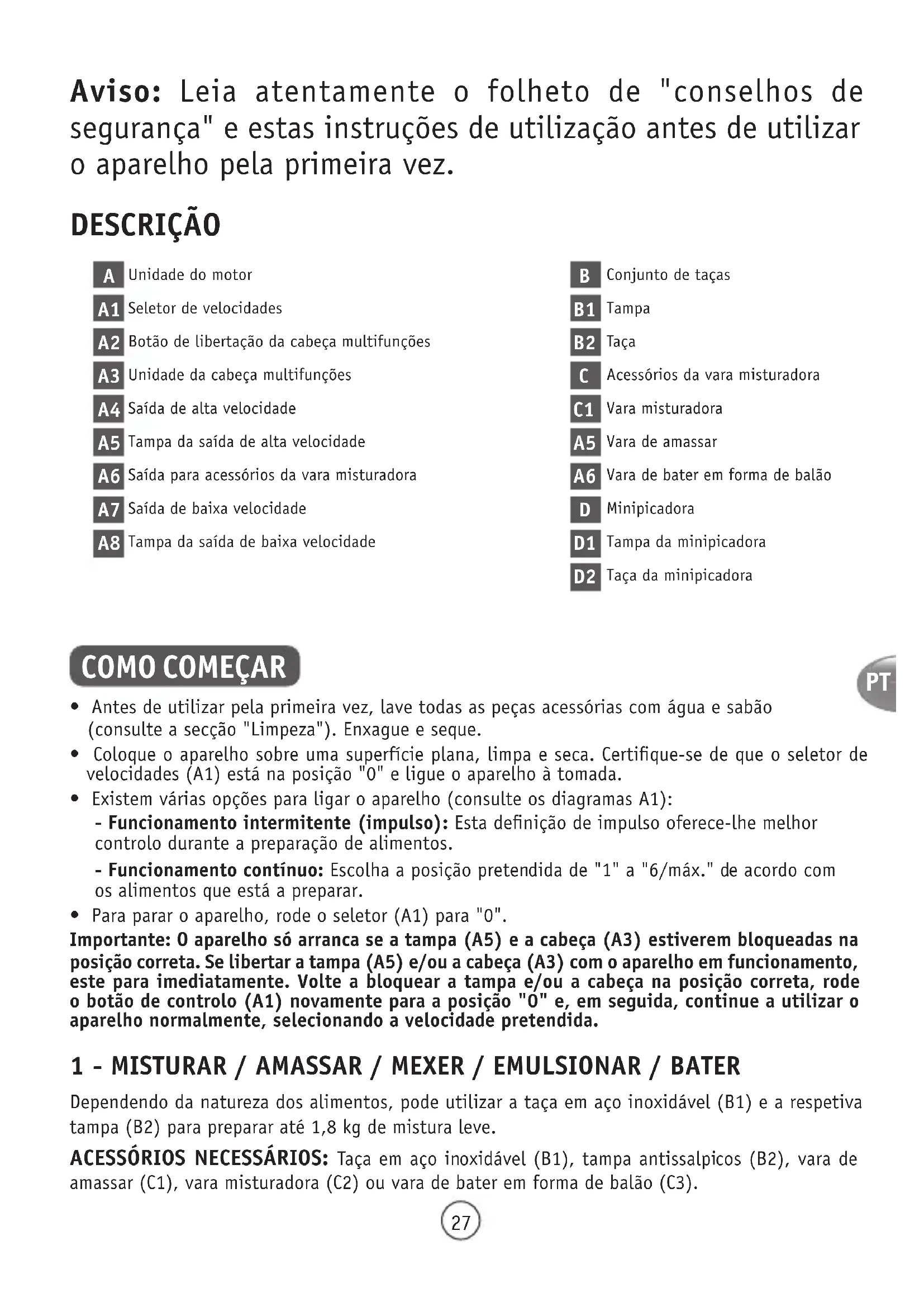Chantilly Ingredientes: 400 ml de natas frias (mínimo de 30% de gordura), 35 g de açúcar em pó. Coloque todos os ingredientes na taça misturadora a frio e, em seguida, coloque a tampa e a vara de bater em forma de balão. Deixe funcionar à velocidade 5 durante 3 minutos e, em seguida, aumente para a velocidade 6 durante 1 minuto. Monitorize a consistência do chantilly a partir dos 3 minutos e 30 segundos, uma vez que pode mudar rapidamente dependendo da temperatura e da quantidade de gordura nas natas.3130 PTPT Merengues Ingredientes: 4 claras de ovo (120 g), 120 g de açúcar refinado, 120 g de açúcar em pó. Pré-aqueça o forno a 95 °C. Coloque as claras de ovo e o açúcar refinado na taça misturadora e, em seguida, coloque a tampa e a vara de bater em forma de balão. Deixe funcionar à velocidade 6 durante 4 minutos. Levante a cabeça misturadora e adicione 120 g de açúcar em pó. Mexa durante mais 2 minutos na velocidade 6. Encha um saco de pasteleiro equipado com um bocal canelado e formas de pasteleiro em papel vegetal colocado sobre um tabuleiro Deixe cozinhar durante 2 horas a 95 °C. Massa para bolos Ingredientes: 200 g de açúcar, 200 g de manteiga à temperatura ambiente, 4 ovos (200 g), 200 g de farinha, 2 colheres de chá de fermento em pó (4 g). Coloque todos os ingredientes na taça e coloque a tampa e a vara misturadora. Deixe o aparelho funcionar à velocidade 1 durante 30 segundos e, em seguida, à velocidade 6 durante 2 minutos. Após estes 2 minutos e 30 segundos, levante a cabeça misturadora e raspe os lados da taça com uma espátula; mexa a massa durante mais 1 minuto à velocidade 6. Verta a massa para uma forma para bolos untada com manteiga e polvilhada com farinha e deixe cozer durante 1 hora num forno pré-aquecido a 180 °C. Massa para panquecas Ingredientes: 250 g de farinha, 500 g de leite, 4 ovos, 2 saquetas de açúcar baunilhado, 6 g de sal. Coloque os ovos, o açúcar baunilhado e o leite na taça misturadora. Coloque a tampa e a vara de bater em forma de balão e misture à velocidade 6. Adicione gradualmente a farinha através da abertura da tampa, utilizando uma colher. Depois de toda a farinha ter sido adicionada, deixe-a misturar durante 1 minuto e, em seguida, passe a mistura por um passador fino. Deixe a massa repousar durante, pelo menos, 1 hora à temperatura ambiente antes de preparar as panquecas. Maionese Ingredientes: 2 gemas de ovo, 20 g de mostarda, uma pitada de sal, 250 ml de óleo. Coloque as gemas de ovo, a mostarda e o sal na taça misturadora. Coloque a tampa e a vara de bater em forma de balão e ligue o aparelho à velocidade 6. Adicione gradualmente o óleo através da abertura da tampa durante 3 minutos. Quando todo o óleo tiver sido incorporado na emulsão, retire a taça e a vara de bater. Manualmente, raspe os lados da taça, misturando a maionese para torná-la firme. Basta mexer três ou quatro vezes. Deve ser consumida dentro de 24 horas. Massa para pão Ingredientes: 300 g de água quente a 30 °C, 500 g de farinha, 10 g de sal, 1 saqueta de levedura seca (5 g). Coloque a farinha, o sal e a levedura seca na taça misturadora. Coloque a tampa e a vara de amassar e, em seguida, ligue a misturadora na velocidade 1. Verta a água gradualmente durante 1 minuto, tal como para a maionese, e, em seguida, deixe-a repousar durante 9 minutos. Cubra a massa e deixe repousar a 35 °C durante 1 hora. Deverá aumentar o tamanho para o dobro. Molde o pão e deixe-o repousar mais uma vez durante 1 hora a 35 °C. O pão deverá aumentar o tamanho para o dobro. Deixe cozinhar durante 30 minutos num forno pré-aquecido a 220 °C, colocando uma taça de água no fundo do forno para criar humidade. Massa para piza Ingredientes para cinco pizzas de 22 cm: 500 g de farinha, 280 g de água quente a 30 °C, 30 g de azeite, 1 saqueta de levedura seca (5 g), 8 g de sal, 10 g de açúcar. Coloque a farinha, o óleo, a levedura, o sal e o açúcar na taça misturadora. Coloque a tampa e a vara de amassar e, em seguida, ligue a misturadora na velocidade 1. Verta a água gradualmente durante 1 minuto, tal como para a maionese, e, em seguida, deixe-a repousar durante 9 minutos. Cubra a massa e deixe repousar a 35 °C durante 1 hora e 30 minutos. Deverá aumentar o tamanho para o dobro. Divida a massa em cinco pedaços de 165 g. Polvilhe farinha na superfície de trabalho e, em seguida, estenda os cinco pedaços em discos de 22 cm. Coloque os discos de massa sobre papel vegetal e, em seguida, decore com as coberturas à escolha. Deixe as pizzas repousar durante 15 minutos e, em seguida, cozinhe uma de cada vez durante 12 minutos num forno pré-aquecido a 230 °C.32 ESES Atención: Lea atentamente el folleto de consejos de seguridad y estas instrucciones de uso antes de utilizar el aparato por primera vez. DESCRIPCIÓN