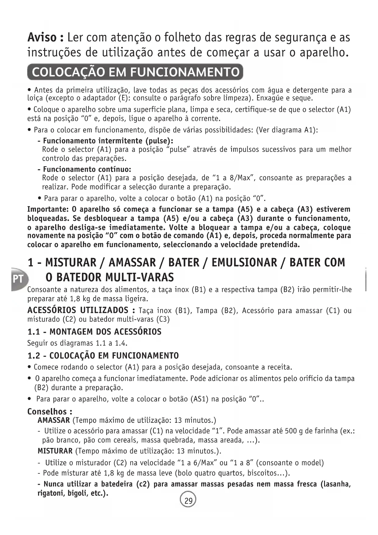 - Comece rodando o selector (A1) para a posição desejada, consoante a receita.• O aparelho começa a funcionar imediatamente. Pode adicionar os alimentos pelo orifício da tampa (B2) durante a preparação.• Para parar o aparelho, volte a colocar o botão (AS1) na posição “0”.. Conselhos : AMASSAR (Tempo máximo de utilização: 13 minutos.)- Utilize o acessório para amassar (C1) na velocidade “1”. Pode amassar até 500 g de farinha (ex.: pão branco, pão com cereais, massa quebrada, massa areada, …).MISTURAR (Tempo máximo de utilização: 13 minutos.).- Utilize o misturador (C2) na velocidade “1 a 6/Max” ou “1 a 8” (consoante o model)- Pode misturar até 1,8 kg de massa leve (bolo quatro quartos, biscoitos…).- Nunca utilizar a batedeira (c2) para amassar massas pesadas nem massa fresca (lasanha, rigatoni, bigoli, etc.).PT