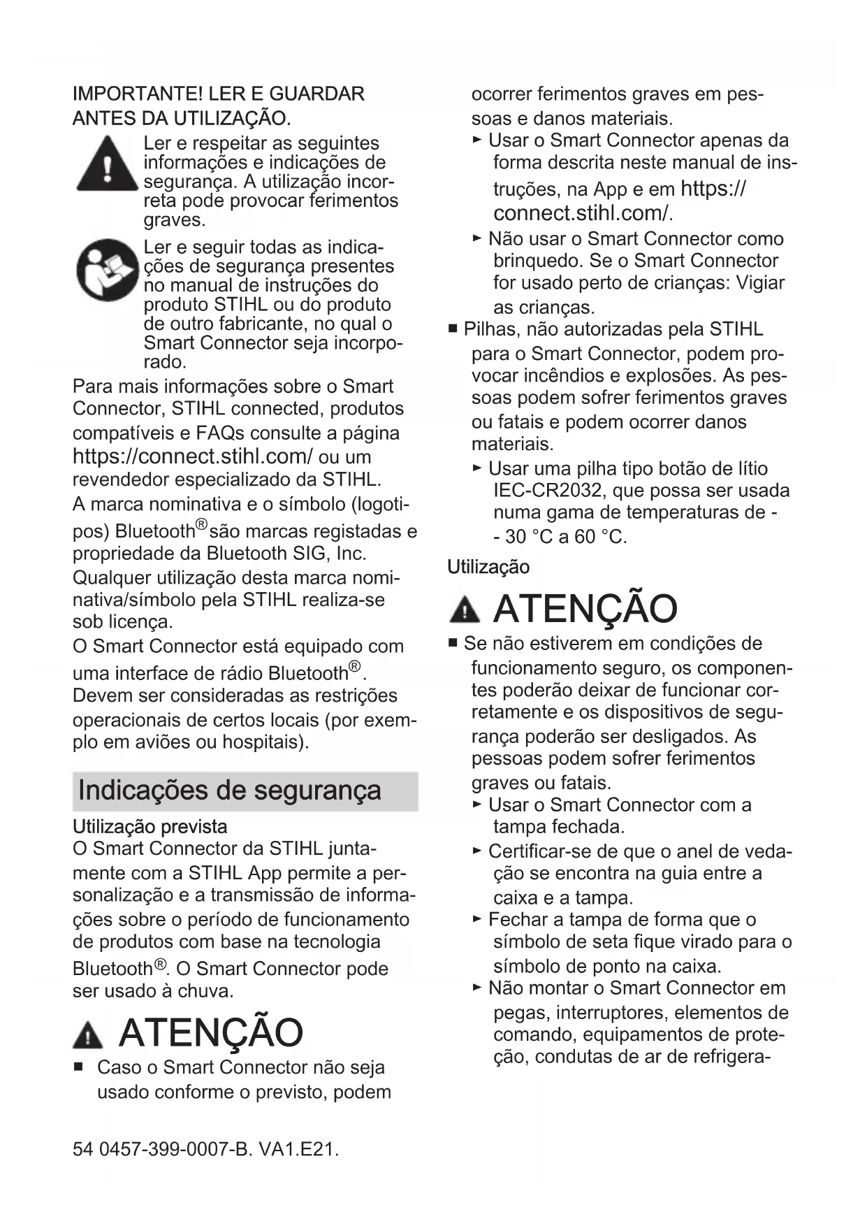 DEPOIS GUARDAR. Ler e observar as seguintes informações e instruções de segurança. O uso inadequado pode resultar em ferimentos graves. Ler e seguir todas as instruções de segurança que constam no manual de instruções do pro‐ duto STIHL ou do produto no qual o Smart Connector está instalado. 62 0457-399-0007-B. VA1.E21.Maiores informações sobre o Smart Connector, Connected STIHL, produtos compatíveis e FAQs estão disponíveis em https://connect.stihl.com/ ou em um Ponto de Vendas STIHL. A marca e símbolo (logo) Bluetooth