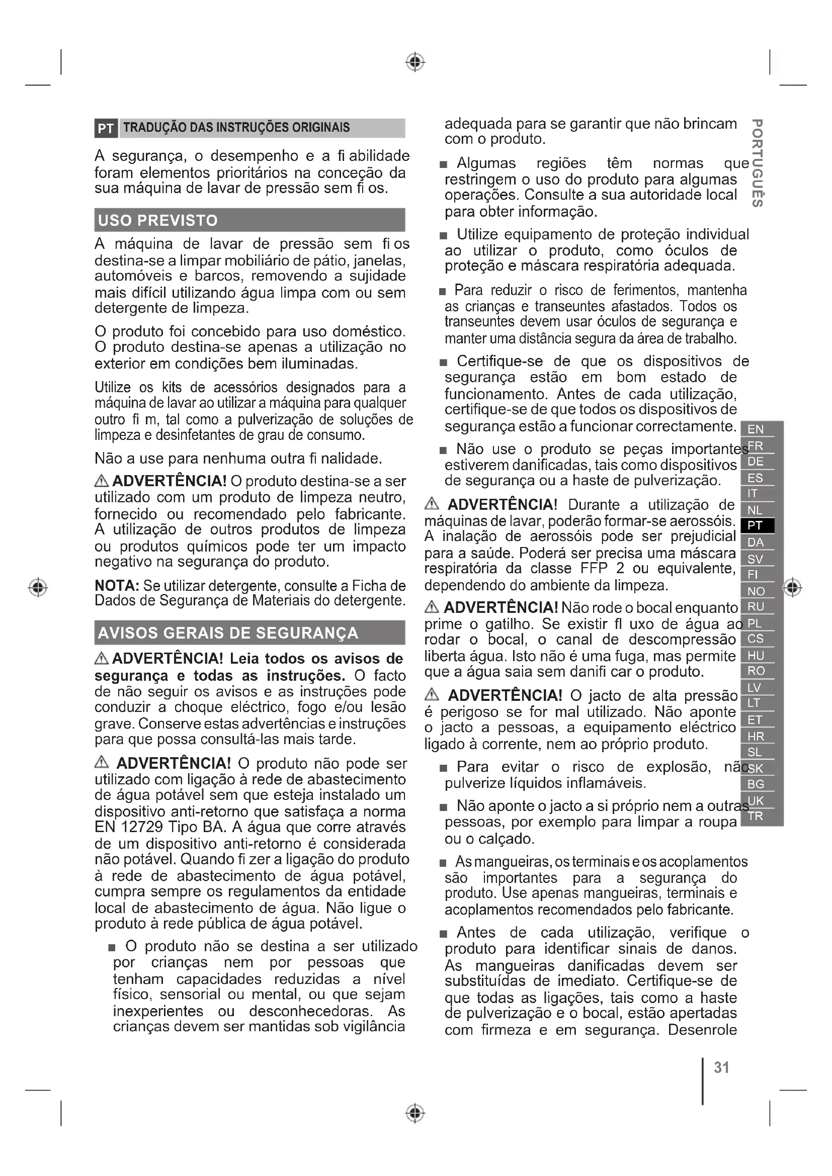 ADVERTÊNCIA! Leia todos os avisos de segurança e todas as instruções. O facto de não seguir os avisos e as instruções pode conduzir a choque eléctrico, fogo e/ou lesão grave. Conserve estas advertências e instruções para que possa consultá-las mais tarde. ADVERTÊNCIA! O produto não pode ser utilizado com ligação à rede de abastecimento de água potável sem que esteja instalado um dispositivo anti-retorno que satisfaça a norma EN 12729 Tipo BA. A água que corre através de um dispositivo anti-retorno é considerada não potável. Quando fi zer a ligação do produto à rede de abastecimento de água potável, cumpra sempre os regulamentos da entidade local de abastecimento de água. Não ligue o produto à rede pública de água potável. ■ O produto não se destina a ser utilizado por crianças nem por pessoas que tenham capacidades reduzidas a nível físico, sensorial ou mental, ou que sejam inexperientes ou desconhecedoras. As crianças devem ser mantidas sob vigilância adequada para se garantir que não brincam com o produto. ■ Algumas regiões têm normas que restringem o uso do produto para algumas operações. Consulte a sua autoridade local para obter informação. ■ Utilize equipamento de proteção individual ao utilizar o produto, como óculos de proteção e máscara respiratória adequada. ■ Para reduzir o risco de ferimentos, mantenha as crianças e transeuntes afastados. Todos os transeuntes devem usar óculos de segurança e manter uma distância segura da área de trabalho. ■ Certifique-se de que os dispositivos de segurança estão em bom estado de funcionamento. Antes de cada utilização, certifique-se de que todos os dispositivos de segurança estão a funcionar correctamente. ■ Não use o produto se peças importantes estiverem danificadas, tais como dispositivos de segurança ou a haste de pulverização. ADVERTÊNCIA! Durante a utilização de máquinas de lavar, poderão formar-se aerossóis. A inalação de aerossóis pode ser prejudicial para a saúde. Poderá ser precisa uma máscara respiratória da classe FFP 2 ou equivalente, dependendo do ambiente da limpeza. ADVERTÊNCIA! Não rode o bocal enquanto prime o gatilho. Se existir fl uxo de água ao rodar o bocal, o canal de descompressão liberta água. Isto não é uma fuga, mas permite que a água saia sem danifi car o produto. ADVERTÊNCIA! O jacto de alta pressão é perigoso se for mal utilizado. Não aponte o jacto a pessoas, a equipamento eléctrico ligado à corrente, nem ao próprio produto. ■ Para evitar o risco de explosão, não pulverize líquidos inflamáveis. ■ Não aponte o jacto a si próprio nem a outras pessoas, por exemplo para limpar a roupa ou o calçado. ■ As mangueiras, os terminais e os acoplamentos são importantes para a segurança do produto. Use apenas mangueiras, terminais e acoplamentos recomendados pelo fabricante. ■ Antes de cada utilização, verifique o produto para identificar sinais de danos. As mangueiras danificadas devem ser substituídas de imediato. Certifique-se de que todas as ligações, tais como a haste de pulverização e o bocal, estão apertadas com firmeza e em segurança. Desenrole PORTUGUÊS