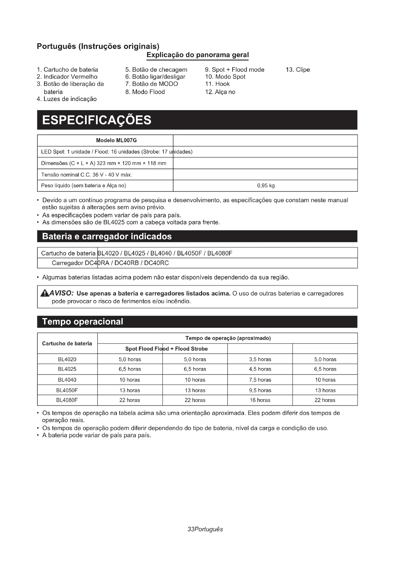 - Algumas baterias listadas acima podem não estar disponíveis dependendo da sua região. AVISO: Use apenas a bateria e carregadores listados acima. O uso de outras baterias e carregadores pode provocar o risco de ferimentos e/ou incêndio. Tempo operacional Cartucho de bateriaTempo de operação (aproximado)Spot Flood Flood + Flood Strobe BL4020 5,0 horas 5,0 horas 3,5 horas 5,0 horas BL4025 6,5 horas 6,5 horas 4,5 horas 6,5 horas BL4040 10 horas 10 horas 7,5 horas 10 horas BL4050F 13 horas 13 horas 9,5 horas 13 horas BL4080F 22 horas 22 horas 16 horas 22 horas