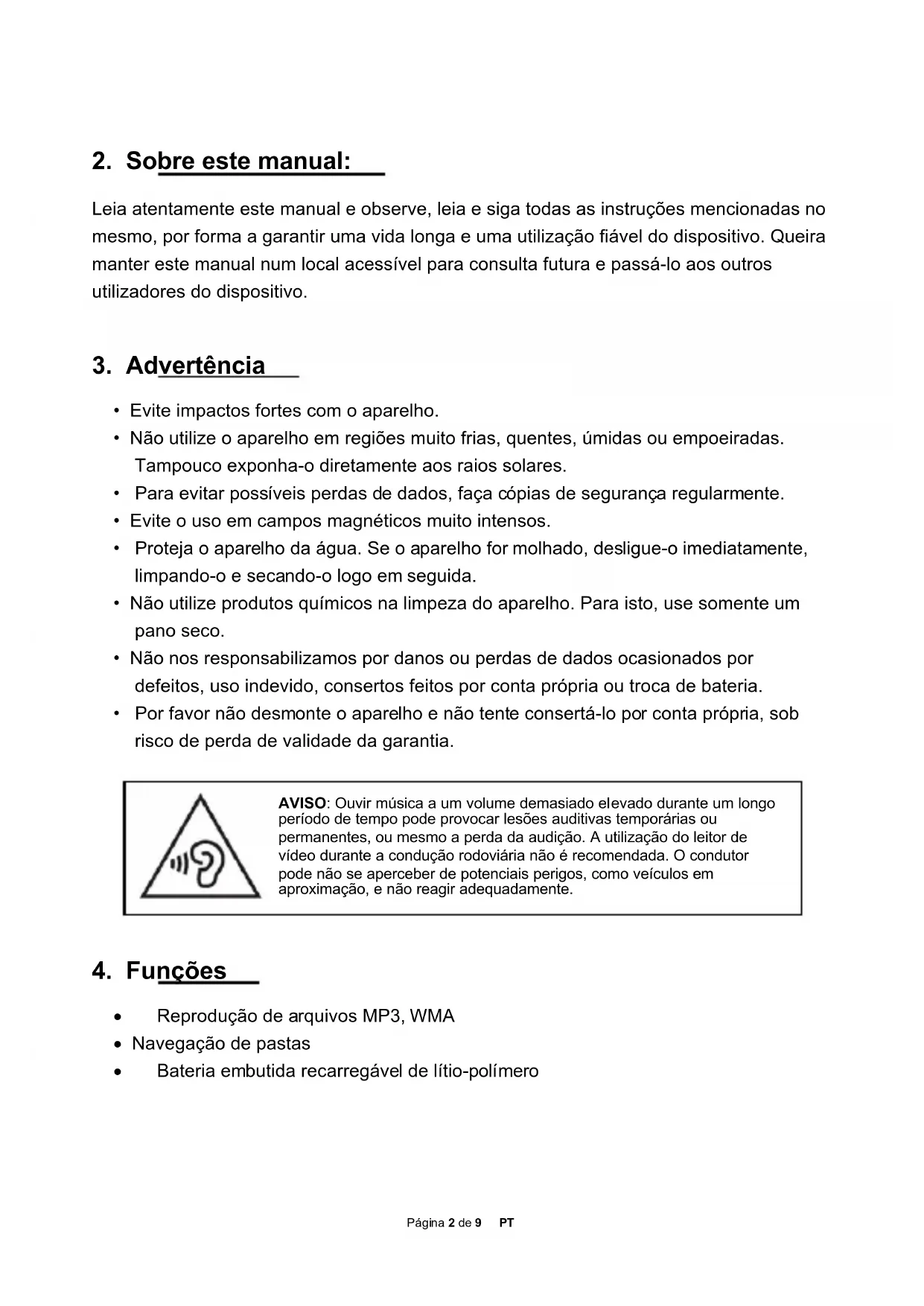 13. Eliminação de aparelhos elétricos usados ............................................................. 9Página 2 de 9 PT AVISO: Ouvir música a um volume demasiado elevado durante um longo período de tempo pode provocar lesões auditivas temporárias ou permanentes, ou mesmo a perda da audição. A utilização do leitor de vídeo durante a condução rodoviária não é recomendada. O condutor pode não se aperceber de potenciais perigos, como veículos em aproximação, e não reagir adequadamente.