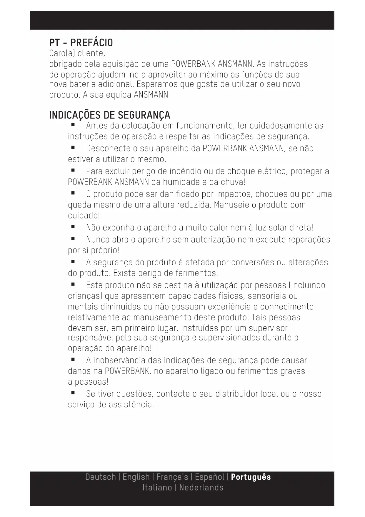 Antes da colocação em funcionamento, ler cuidadosamente as instruções de operação e respeitar as indicações de segurança. Desconecte o seu aparelho da POWERBANK ANSMANN, se não estiver a utilizar o mesmo. Para excluir perigo de incêndio ou de choque elétrico, proteger a POWERBANK ANSMANN da humidade e da chuva! O produto pode ser danificado por impactos, choques ou por uma queda mesmo de uma altura reduzida. Manuseie o produto com cuidado! Não exponha o aparelho a muito calor nem à luz solar direta! Nunca abra o aparelho sem autorização nem execute reparações por si próprio! A segurança do produto é afetada por conversões ou alterações do produto. Existe perigo de ferimentos! Este produto não se destina à utilização por pessoas (incluindo crianças) que apresentem capacidades físicas, sensoriais ou mentais diminuídas ou não possuam experiência e conhecimento relativamente ao manuseamento deste produto. Tais pessoas devem ser, em primeiro lugar, instruídas por um supervisor responsável pela sua segurança e supervisionadas durante a operação do aparelho! A inobservância das indicações de segurança pode causar danos na POWERBANK, no aparelho ligado ou ferimentos graves a pessoas! Se tiver questões, contacte o seu distribuidor local ou o nosso serviço de assistência.