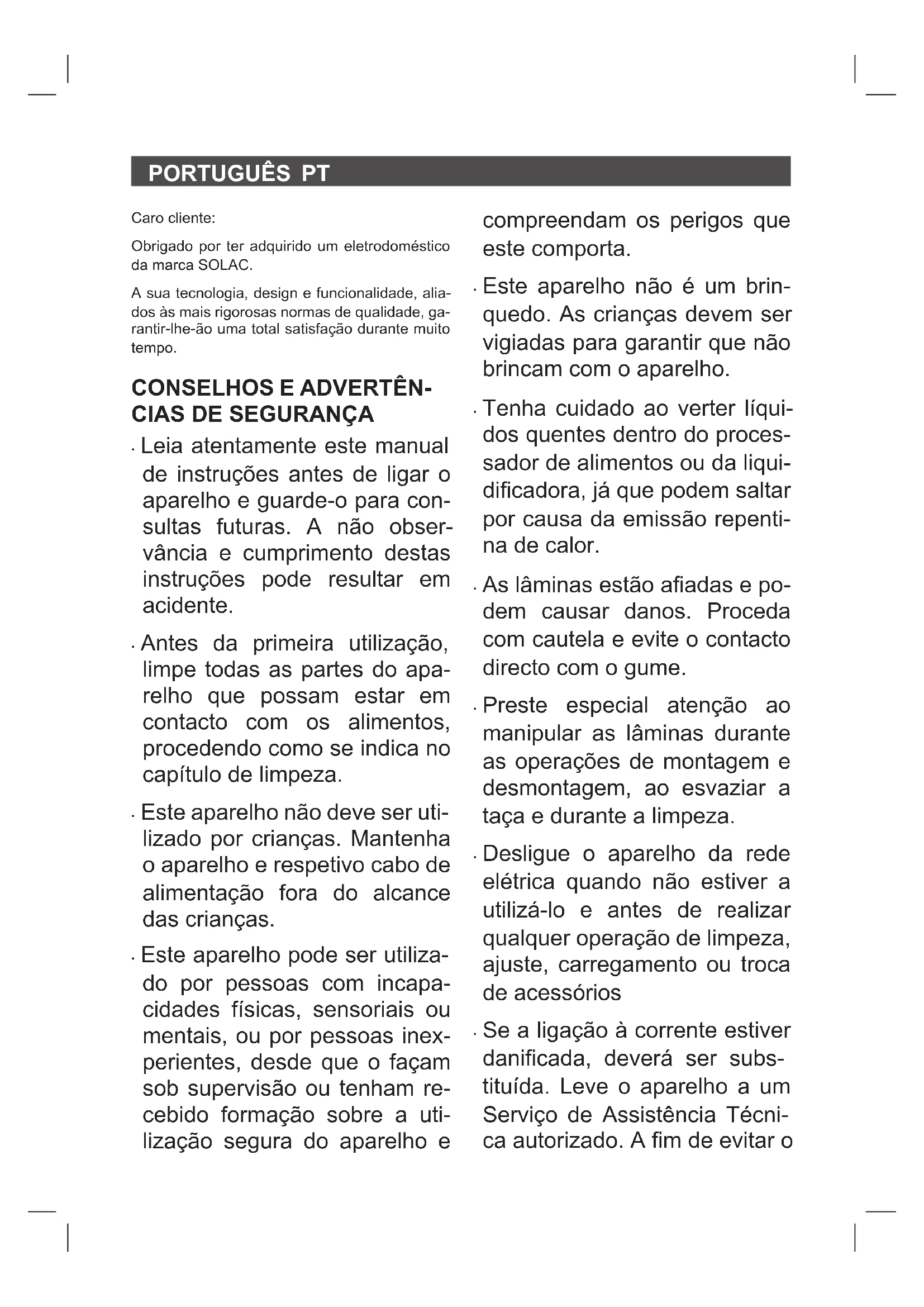 Caro cliente: Obrigado por ter adquirido um eletrodoméstico da marca SOLAC. A sua tecnologia, design e funcionalidade, alia- dos às mais rigorosas normas de qualidade, ga- rantir-lhe-ão uma total satisfação durante muito tempo.