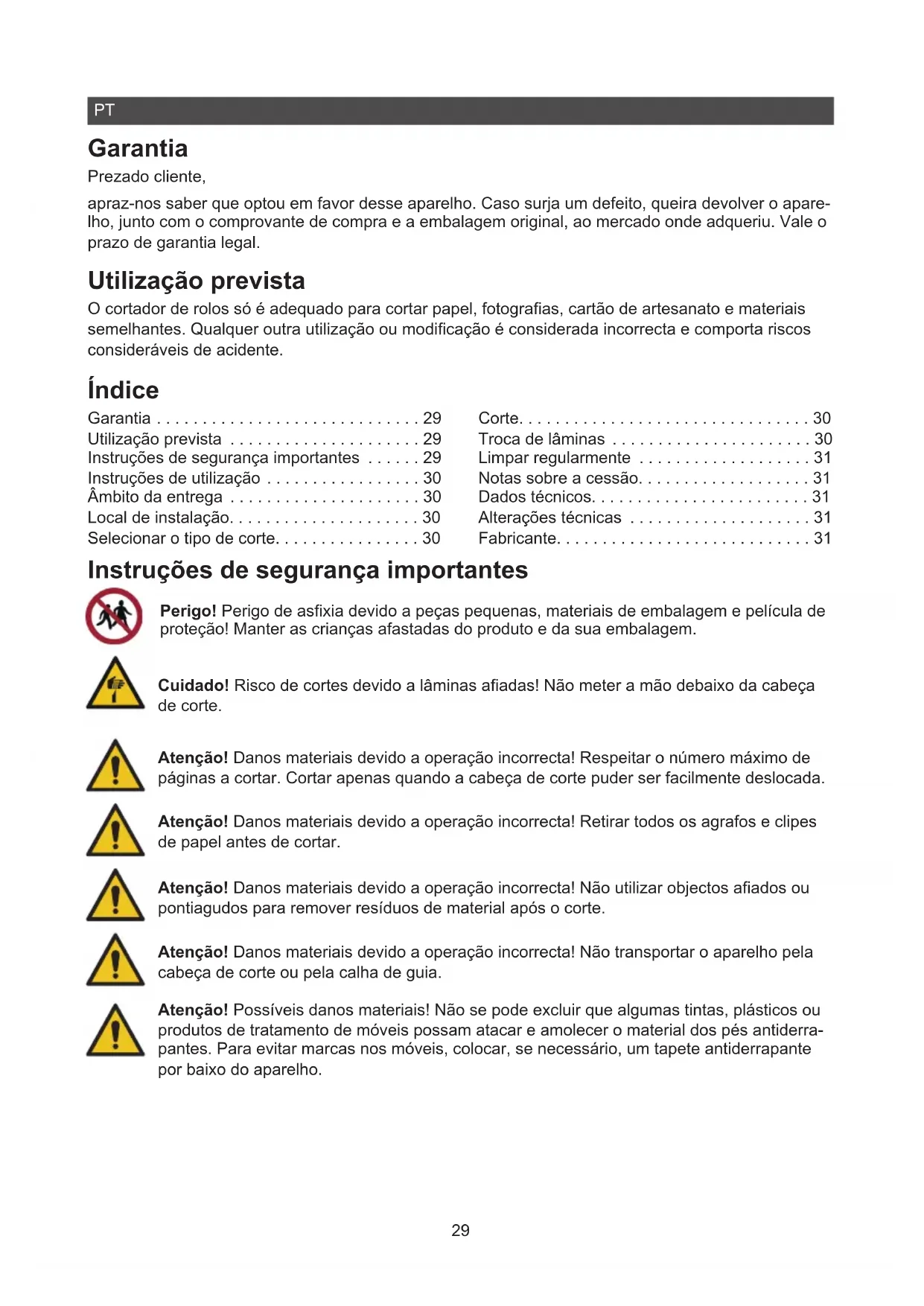 - Garantia Prezado cliente, apraz-nos saber que optou em favor desse aparelho. Caso surja um defeito, queira devolver o apare- lho, junto com o comprovante de compra e a embalagem original, ao mercado onde adqueriu. Vale o prazo de garantia legal. Utilização prevista O cortador de rolos só é adequado para cortar papel, fotograas, cartão de artesanato e materiais semelhantes. Qualquer outra utilização ou modicação é considerada incorrecta e comporta riscos consideráveis de acidente. Índice Garantia p. 29