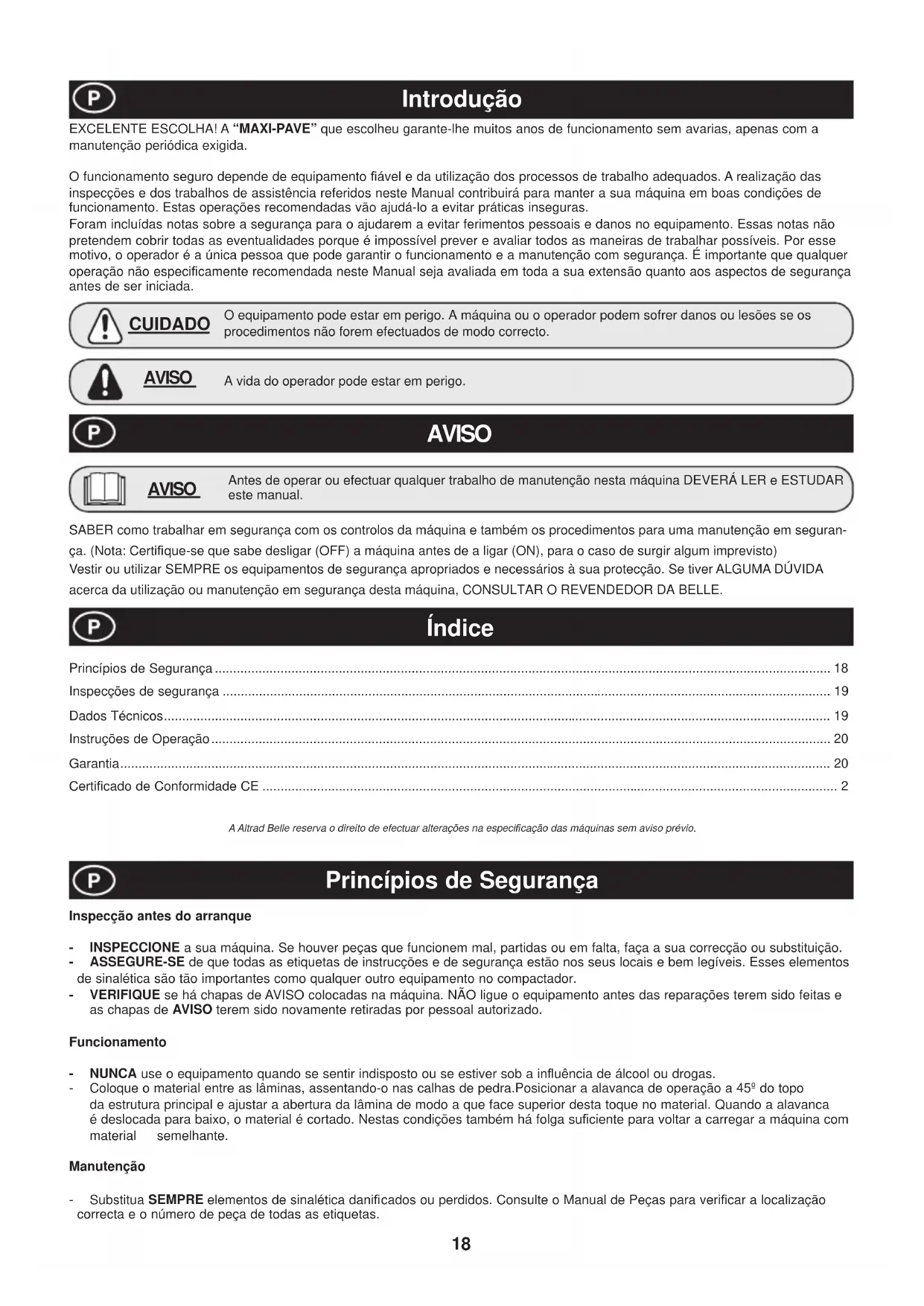- Certi¿ cado de Conformidade CE A Altrad Belle reserva o direito de efectuar alterações na especi¿ cação das máquinas sem aviso prévio. Princípios de Segurança Inspecção antes do arranque - INSPECCIONE a sua máquina. Se houver peças que funcionem mal, partidas ou em falta, faça a sua correcção ou substituição. - ASSEGURE-SE de que todas as etiquetas de instrucções e de segurança estão nos seus locais e bem legíveis. Esses elementos de sinalética são tão importantes como qualquer outro equipamento no compactador. - VERIFIQUE se há chapas de AVISO colocadas na máquina. NÃO ligue o equipamento antes das reparações terem sido feitas e as chapas de AVISO terem sido novamente retiradas por pessoal autorizado. Funcionamento - NUNCA use o equipamento quando se sentir indisposto ou se estiver sob a inÀ uência de álcool ou drogas. - Coloque o material entre as lâminas, assentando-o nas calhas de pedra.Posicionar a alavanca de operação a 45º do topo da estrutura principal e ajustar a abertura da lâmina de modo a que face superior desta toque no material. Quando a alavanca é deslocada para baixo, o material é cortado. Nestas condições também há folga su¿ ciente para voltar a carregar a máquina com material semelhante. Manutenção - Substitua SEMPRE elementos de sinalética dani¿ cados ou perdidos. Consulte o Manual de Peças para veri¿ car a localização correcta e o número de peça de todas as etiquetas. O equipamento pode estar em perigo. A máquina ou o operador podem sofrer danos ou lesões se os procedimentos não forem efectuados de modo correcto. CUIDADO A vida do operador pode estar em perigo. AVISO AVISO Antes de operar ou efectuar qualquer trabalho de manutenção nesta máquina DEVERÁ LER e ESTUDAR este manual. AVISO Índice SABER como trabalhar em segurança com os controlos da máquina e também os procedimentos para uma manutenção em seguran- ça. (Nota: Certi¿ que-se que sabe desligar (OFF) a máquina antes de a ligar (ON), para o caso de surgir algum imprevisto) Vestir ou utilizar SEMPRE os equipamentos de segurança apropriados e necessários à sua protecção. Se tiver ALGUMA DÚVIDA acerca da utilização ou manutenção em segurança desta máquina, CONSULTAR O REVENDEDOR DA BELLE.19 Inspecções de segurança Dados Técnicos Uma manutenção inadequada pode ser um factor de risco. Leia e compreenda as PRECAUÇÕES E OS PRINCÍPIOS DE SEGURANÇA antes de proceder a qualquer operação de manutenção, assistência técnica ou reparação. CUIDADO Antes do início de cada dia de trabalho, para além dos 10 minutos de manutenção diária de rotina, faça as inspecções seguintes a ¿ m de garantir um funcionamento isento de problemas. p. 2