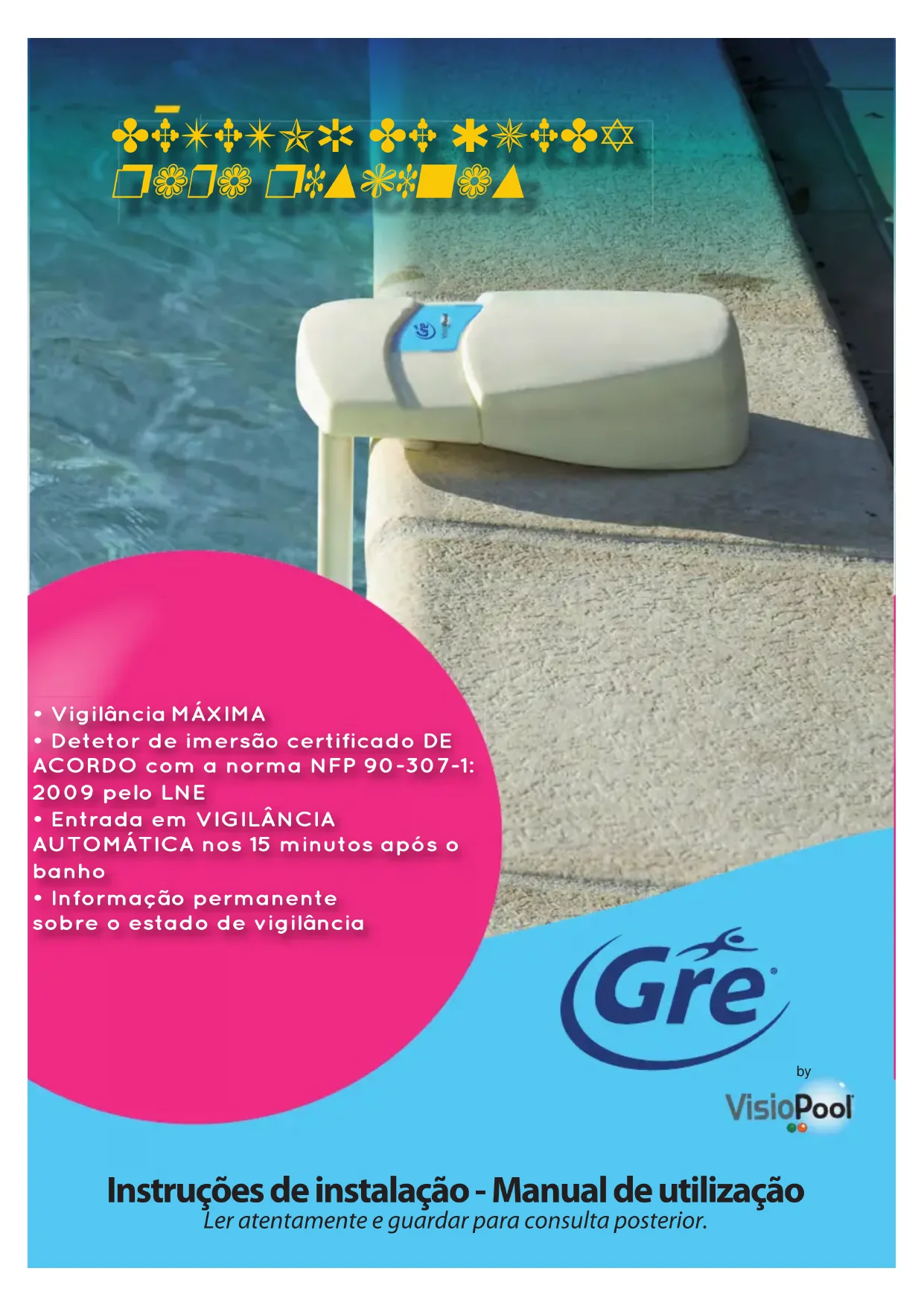 - Informação permanente sobre o estado de vigilância Instruções de instalação - Manual de utilização Ler atentamente e guardar para consulta posterior. byPágina 2 Alarme para piscinas GRE by VisioPool® - Instruções de instalação - Manual de utilização Dezembro 2016 AVISO Minha Senhora, Meu Senhor, Acaba de adquirir um alarme para piscina de acordo com a norma francesa NPF 90-307- 1:2009. Este sistema não substitui o bom senso ou a responsabilidade individual. A segurança dos seus lhos apenas depende de si! O risco é máximo quando as crianças têm menos de 5 anos de idade. Os acidentes não acontecem só aos outros! Esteja pronto para lidar com isso! Em qualquer caso, a companhia ACIS não poderá ser tida omo responsável pela queda ou afogamento de qualquer pessoa ou animal. A implementação do dispositivo Gre By VisioPool® não deve fazer diminuir a sua vigilância ou substituir uma vigilância ativa da piscina e suas proximidades. Garantia: para bene ciar totalmente da garantia Gre By VisioPool®, deve imperativemente preencher e assinar a cha de garantia fornecida e devolvê-la no prazo de 8 dias à empresa ACIS - 15, rue des Marais - 44310 ST PHILBERT DE GRAND LIEU (França) por carta registrada (carta registada com aviso de recepção, acompanhamento de correspondências dos correios). A garantia do alarme Gre By VisioPool® não terá efeito até à receção do certi cado de garantia devidamente preenchido. Sem a devolução desses elementos, nenhuma garantia poderá ser dada. Leia-a cuidadosamente e guarde qualquer documento relativo ao alarme Gre By VisioPool® para consulta posterior.Dezembro 2016 Alarme para piscinas GRE by VisioPool® - Instruções de instalação - Manual de utilização Página 3 Tabela de Conteúdos Aviso ......................................................................................................... 4 Controles preliminares ................................................................... 5 Controlo da embalagem e dos componentes .......................... 5 Controlo antes de colocar em funcionamento ......................... 6 Escolha da localização ....................................................................... 7 Instalação na margem .................................................................... 8 Teste de funcionamento na piscina ........................................... 9 Pilhas alcalinas .................................................................................... 10 Utilização............................................................................................. 11 Hibernação ........................................................................................... 11 Paragem completa ............................................................................12 Advertências ........................................................................................12 Informações complementares ...................................................... 13 Informações legais ............................................................................13 Informações sobre o alarme Gre By VisioPool® .......................13 Conselhos de segurança .............................................................. 14Página 4 Alarme para piscinas GRE by VisioPool® - Instruções de instalação - Manual de utilização Dezembro 2016 Apresentação Sistema detector da imersão ou queda de um corpo, adaptável à margem de piscinas enterradas, semi-enterradas ou acima do solo com dimensões de aproximadamente 12 x 5 m (raio de ação : 7 metros). Além disso, recomendamos que equipe a piscina com medidas de proteção adicionais, em conformidade com a norma francesa NFP 90-307-1:2009. De acordo com a norma NFP 90-307-1:2009, o seu alarme está con gurado para uma piscina retangular de 4 x 8 m, profundidade de 1,40 m (o tipo de piscina mais difundida em França). Gre By VisioPool® é adequado para piscinas até, aproximadamente, 5 x 12 m. Gre By VisioPool® analisa o movimento da água na sua piscina e sabe como distinguir as ondas parasitas (cascata, ltração, chuva, vento) das emitidas pela queda de um corpo. O tempo de ativação está relacionado com a distância entre o detetor e o ponto de imersão. Atenção! A instalação e utilização de um sistema de alarme não é um substituto para a sua vigilância. O alarme Gre By VisioPool® é uma ferramenta complementar à vigilância humana para a vigilância das piscinas. Este processo não substitui a atenção dos adultos. Vigie os seus lhos com atenção! Limites de utilização