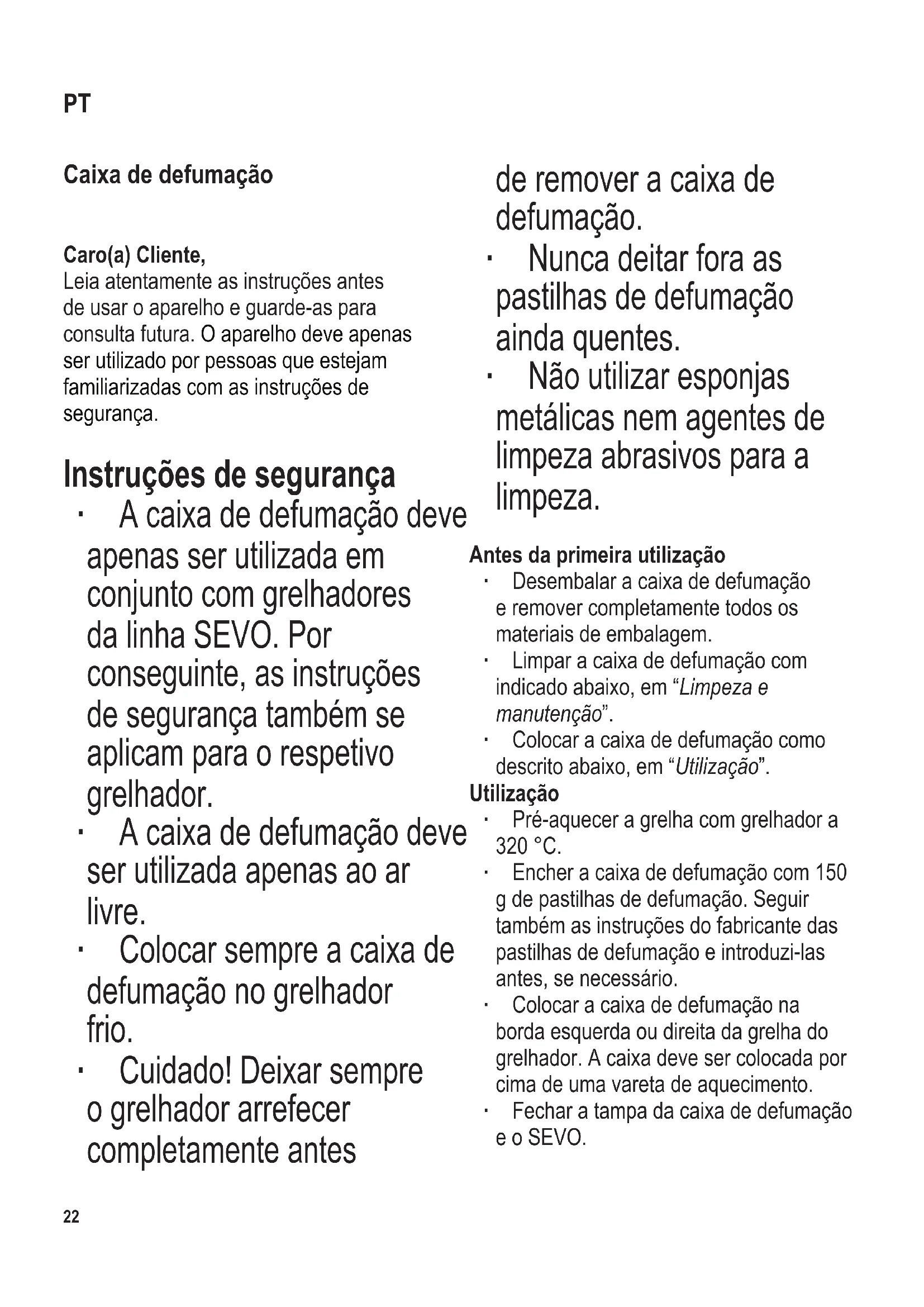 ∙ Após cerca de 8 minutos, vericar se é visível um bom desenvolvimento de fumo. ∙ Fechar a tampa e colocar a grelha à temperatura pretendida. Para a denição da temperatura, seguir as instruções da receita. ∙ Aguardar um pouco até que a grelha já não esteja demasiado quente e depois colocar os alimentos a serem defumados à volta da caixa de defumação, fechando novamente a tampa do SEVO. ∙ A duração do processo de defumação depende do alimento a ser defumado e das pastilhas de defumação utilizadas. Agradecemos que siga as instruções da receita utilizada e as instruções do fabricante das pastilhas. ∙ Durante um processo de defumação mais longo, vericar o desenvolvimento do fumo de vez em quando e, se necessário, voltar a encher com novas pastilhas de defumação assim que o desenvolvimento do fumo diminuir consideravelmente. ∙ Cuidado! Quando voltar a abastecer com pastilhas de defumação durante o processo de defumação, não se esqueça de usar luvas de grelhador resistentes ao calor! Limpeza e manutenção ∙ Cuidado! Deixar sempre o grelhador arrefecer completamente antes de remover a caixa de defumação. ∙ Limpar a caixa de defumação arrefecida após cada utilização. ∙ Não utilizar esponjas metálicas nem agentes de limpeza abrasivos para a limpeza. ∙ Retirar a caixa de defumação e lavar com água de enxaguamento, podendo deixá-la de molho. Qualquer descoloração da caixa de defumação é inevitável e não constitui um defeito. ∙ Depois da limpeza, secar bem e guardar numa divisão seca. ∙ A caixa de defumação SEVO também pode ser lavada na máquina de lavar louça. Eliminação Os aparelhos marcados com este símbolo devem ser eliminados separadamente dos resíduos domésticos, já que contêm materiais valiosos que podem ser reciclados. A eliminação adequada protege o ambiente e a saúde humana. As suas autoridades locais ou o revendedor podem facultar-lhe informações sobre o assunto.24 104 x 142 mm Garantia Nas seguintes condições, os direitos de garantia obrigatórios perante o vendedor e eventuais garantias permanecem intactos. Caso necessite de usufruir da sua garantia, contacte o comerciante diretamente. Além disso, a SEVERIN concede uma garantia de 2 anos com efeito a partir da data da compra do produto. Neste período, resolveremos qualquer defeito de fabrico ou de material que prejudique signicativamente o funcionamento do aparelho. Quaisquer outras reivindicações serão rejeitadas. Excluídos da garantia estão: Danos causados devido à não observância das instruções de uso, manuseio inadequado ou desgaste normal, bem como peças facilmente quebráveis, como, por exemplo, vidro, plástico ou lâmpadas. A garantia expira em caso de intervenção de agências não autorizadas pela SEVERIN. Se for necessária uma reparação, entre em contacto com o nosso atendimento ao cliente por telefone ou por e-mail. Os detalhes de contacto estão anexados a este manual.104 x 142 mm