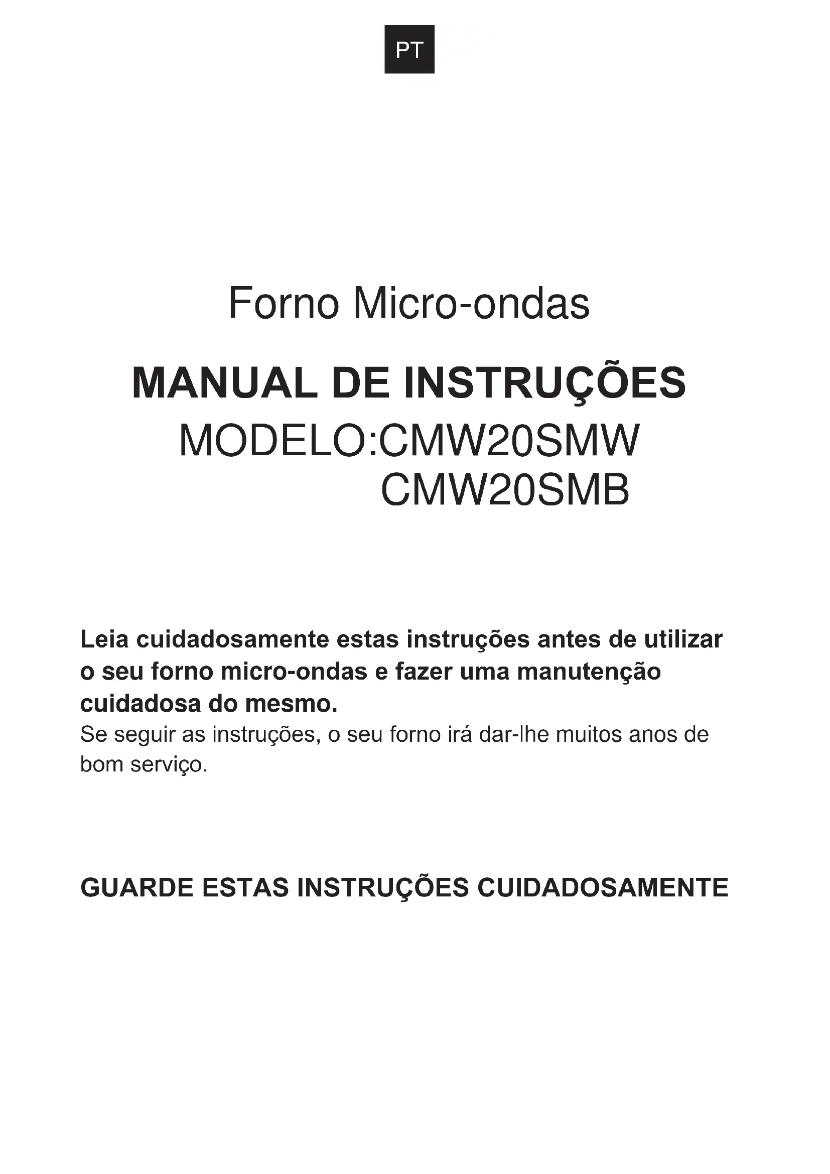 CMW20SMB Leia cuidadosamente estas instruções antes de utilizar o seu forno micro-ondas e fazer uma manutenção cuidadosa do mesmo. Se seguir as instruções, o seu forno irá dar-lhe muitos anos de bom serviço.