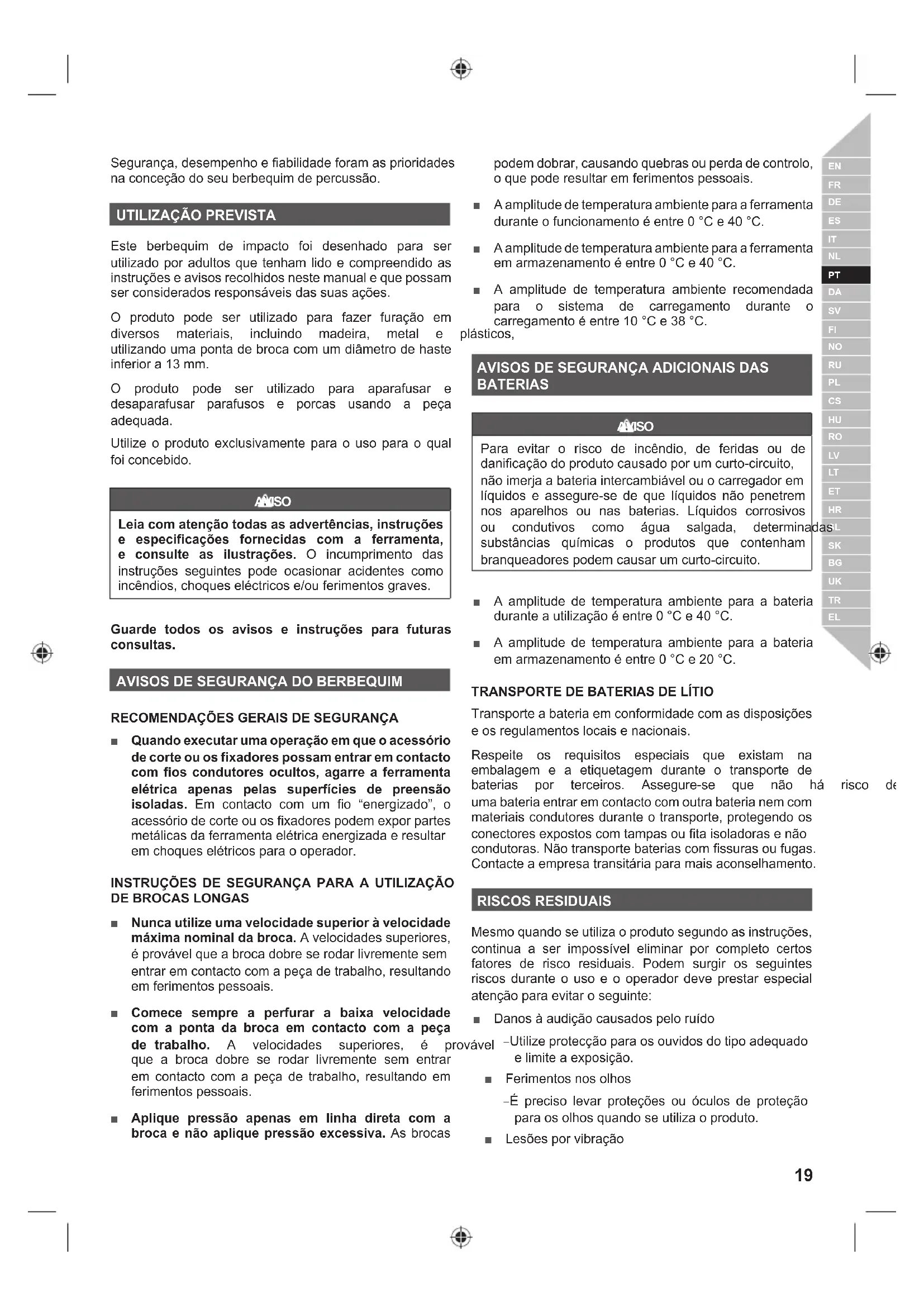 Este berbequim de impacto foi desenhado para ser utilizado por adultos que tenham lido e compreendido as instruções e avisos recolhidos neste manual e que possam VHUFRQVLGHUDGRVUHVSRQViYHLVGDVVXDVDo}HV O produto pode ser utilizado para fazer furação em GLYHUVRV PDWHULDLV LQFOXLQGR PDGHLUD PHWDO H SOiVWLFRV utilizando uma ponta de broca com um diâmetro de haste inferior a 13 mm. O produto pode ser utilizado para aparafusar e desaparafusar parafusos e porcas usando a peça adequada. Utilize o produto exclusivamente para o uso para o qual foi concebido. AVISO Leia com atenção todas as advertências, instruções e especificações fornecidas com a ferramenta, e consulte as ilustrações. O incumprimento das instruções seguintes pode ocasionar acidentes como LQFrQGLRVFKRTXHVHOpFWULFRVHRXIHULPHQWRVJUDYHV Guarde todos os avisos e instruções para futuras consultas.