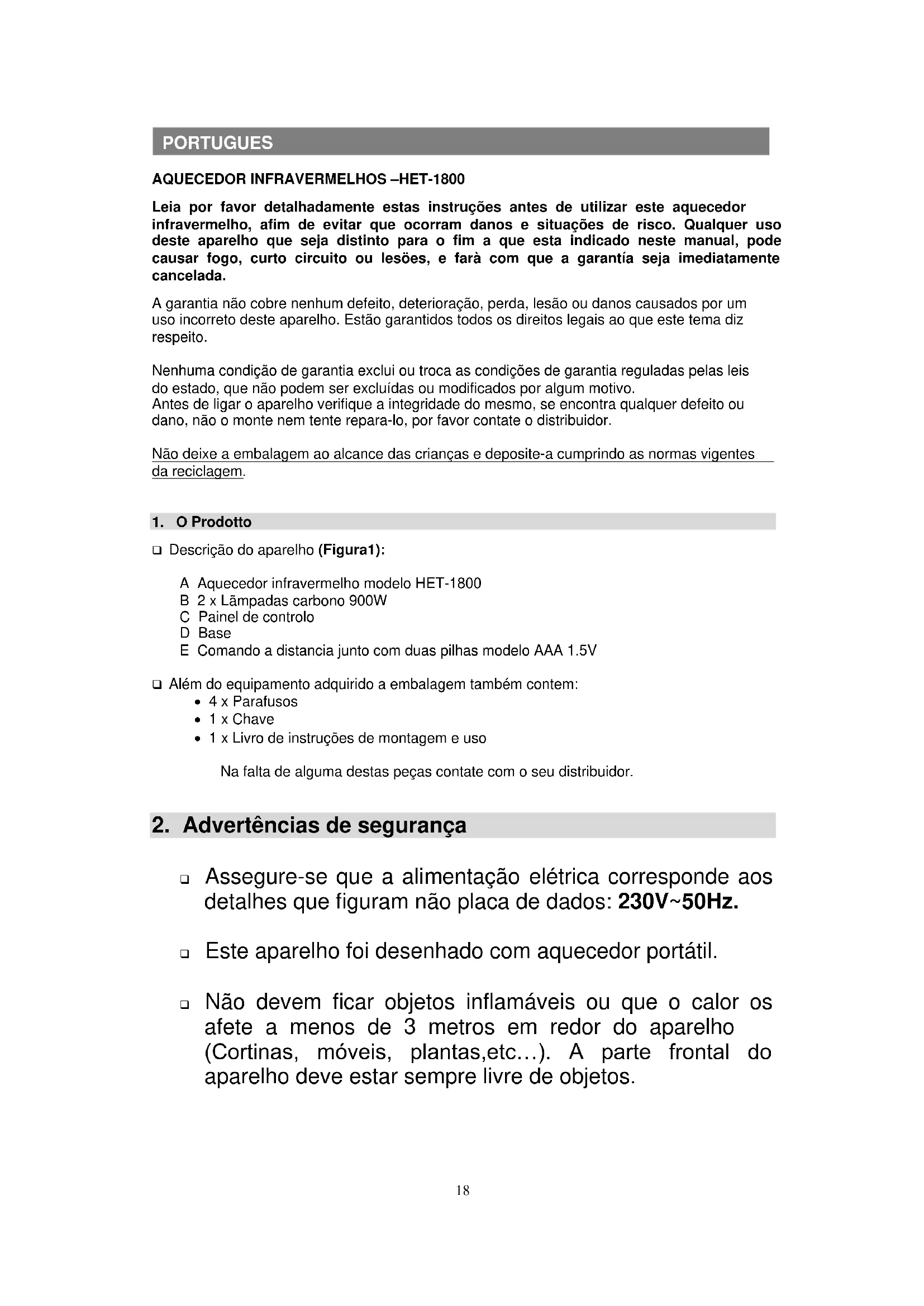 Leia por favor detalhadamente estas instruções antes de utilizar este aquecedor infravermelho, afim de evitar que ocorram danos e situações de risco. Qualquer uso deste aparelho que seja distinto para o fim a que esta indicado neste manual, pode causar fogo, curto circuito ou lesöes, e farà com que a garantía seja imediatamente cancelada. A garantia não cobre nenhum defeito, deterioração, perda, lesão ou danos causados por um uso incorreto deste aparelho. Estão garantidos todos os direitos legais ao que este tema diz respeito. Nenhuma condição de garantia exclui ou troca as condições de garantia reguladas pelas leis do estado, que não podem ser excluídas ou modificados por algum motivo. Antes de ligar o aparelho verifique a integridade do mesmo, se encontra qualquer defeito ou dano, não o monte nem tente repara-lo, por favor contate o distribuidor. Não deixe a embalagem ao alcance das crianças e deposite-a cumprindo as normas vigentes da reciclagem.