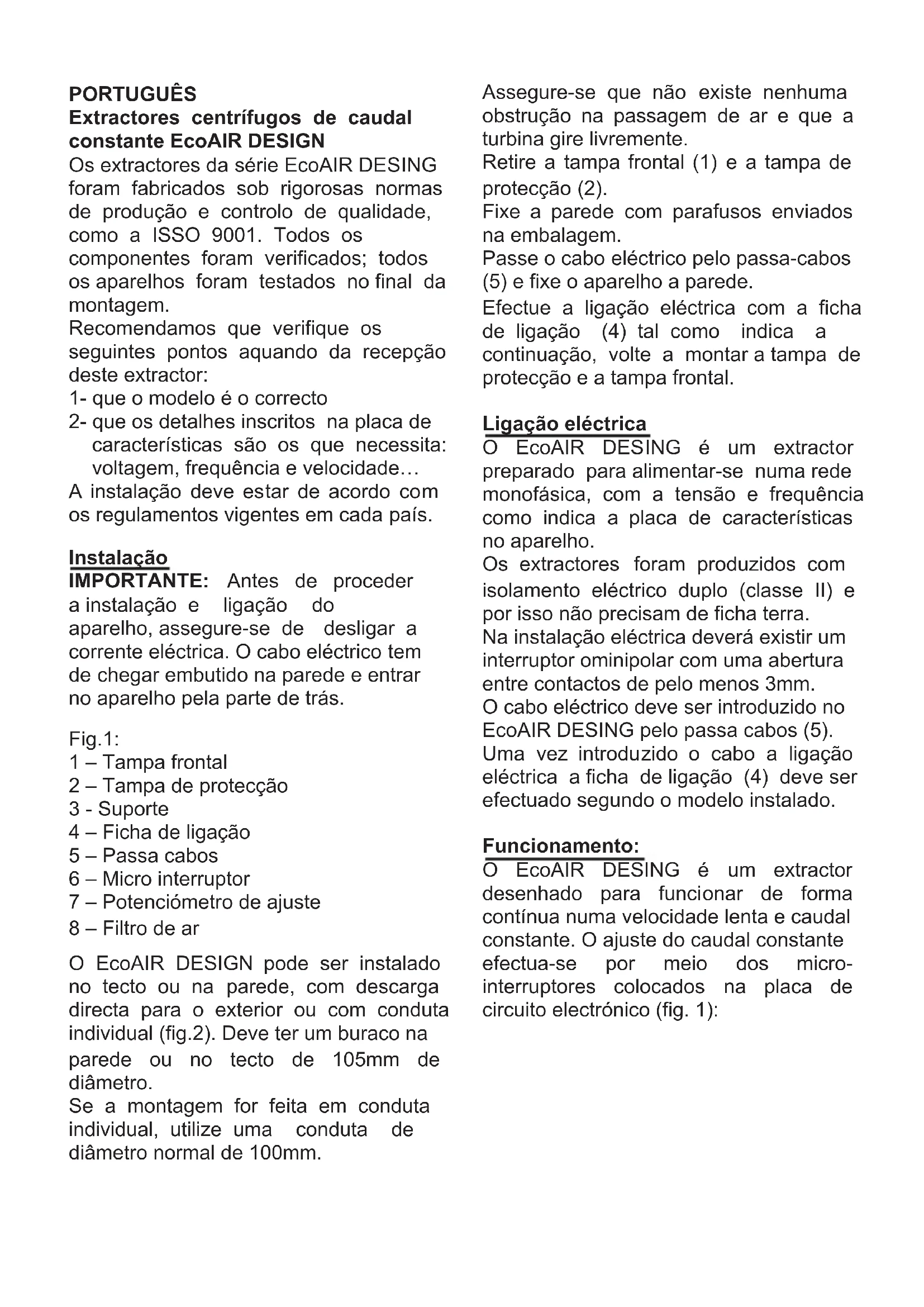 O EcoAIR DESIGN pode ser instalado no tecto ou na parede, com descarga directa para o exterior ou com conduita individual (fig.2). Deve ter um buraco na parede ou no tecto de 105mm de diametro.