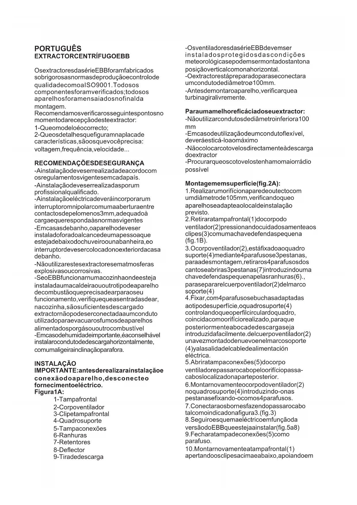 INSTALAÇÃO IMPORTANTE: antes de realizar a instalação e conexão do aparelho, desconecte o fornecimento eléctrico. Figura1A: Para uma melhor eficácia do seu extractor: Montagem em superfície (fig.2A): Os extractores da série EBB foram fabricados sob rigorosas normas de produção e controlo de qualidade como a ISO 9001. Todos os componentes foram verificados; todos os aparelhos foram ensaiados no final da montagem. Recomendamos verificar os seguintes pontos no momento da recepção deste extractor: