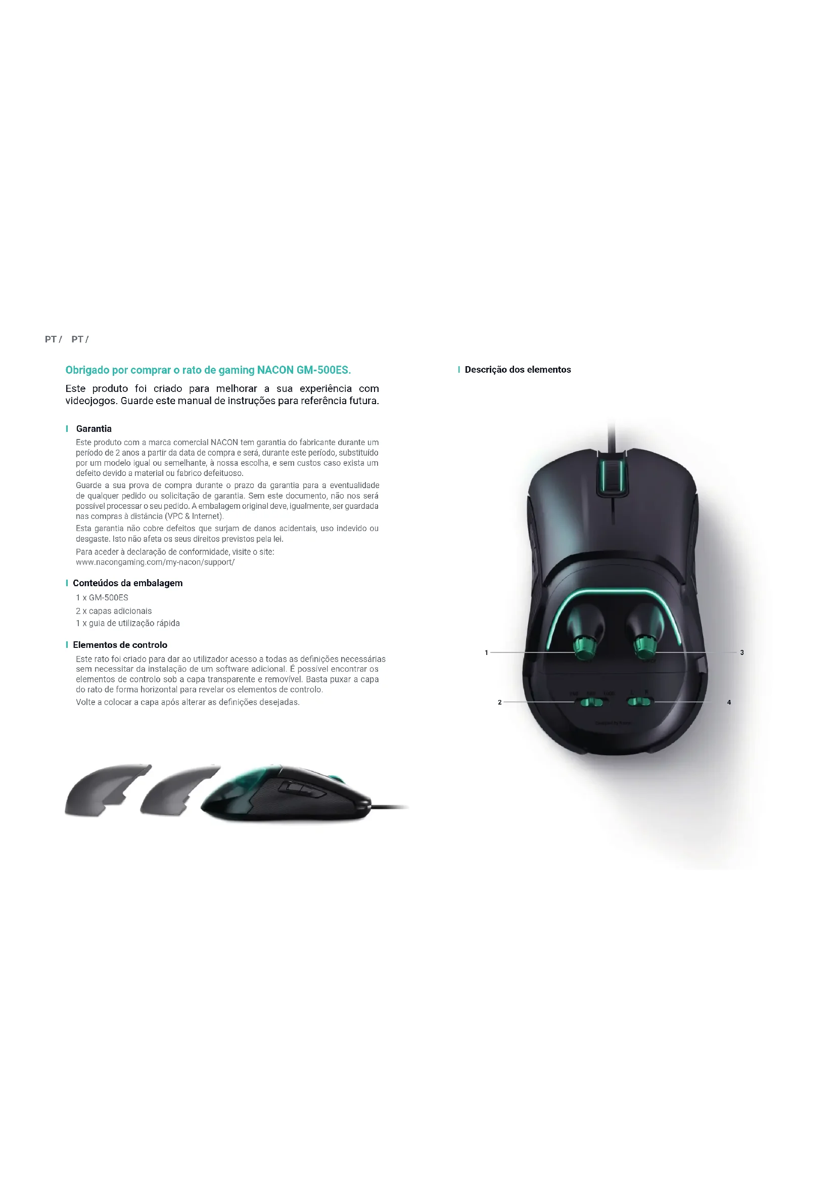 Per le operazioni di pulizia esterna, utilizzare un panno morbido, pulito e inumidito. Non utilizzare detergenti: potrebbero danneggiare le niture e penetrare all’interno. 6/ Non trasportare mai il prodotto tenendolo per il cavo. 7/ Questo prodotto non è stato progettato per essere utilizzato da persone (bambini inclusi) con ridotte capacità siche, sensoriali o mentali, o da persone con conoscenze o esperienza insufcienti, a eccezione del caso in cui agiscano sotto la supervisione di una persona responsabile della loro incolumità che le abbia istruite sul corretto utilizzo del prodotto. Tenere questo dispositivo fuori dalla portata dei bambini. I Ergonomia Mantenere la mano nella stessa posizione per lunghi periodi di tempo potrebbe provocare fastidi e dolore. Se ciò dovesse vericarsi, consultare un medico. Come misura precauzionale, si consiglia di fare 15 minuti di pausa per ogni ora di utilizzo. I Servizio di assistenza Per qualsiasi informazione, potete contattare il nostro servizio di assistenza, ma vi consigliamo di raccogliere prima tutte le informazioni inerenti il problema riscontrato e il prodotto. Email: support.it@nacongaming.com Sito Internet: www.nacongaming.com Indirizzo: Bigben Interactive – Corso Sempione - 221 - 20025 Legnano (MI) ItaliaPT / PT / Obrigado por comprar o rato de gaming NACON GM-500ES. Este produto foi criado para melhorar a sua experiência com videojogos. Guarde este manual de instruções para referência futura. I Garantia Este produto com a marca comercial NACON tem garantia do fabricante durante um período de 2 anos a partir da data de compra e será, durante este período, substituído por um modelo igual ou semelhante, à nossa escolha, e sem custos caso exista um defeito devido a material ou fabrico defeituoso. Guarde a sua prova de compra durante o prazo da garantia para a eventualidade de qualquer pedido ou solicitação de garantia. Sem este documento, não nos será possível processar o seu pedido. A embalagem original deve, igualmente, ser guardada nas compras à distância (VPC & Internet). Esta garantia não cobre defeitos que surjam de danos acidentais, uso indevido ou desgaste. Isto não afeta os seus direitos previstos pela lei. Para aceder à declaração de conformidade, visite o site: www.nacongaming.com/my-nacon/support/ I Conteúdos da embalagem 1 x GM-500ES 2 x capas adicionais 1 x guia de utilização rápida I Elementos de controlo Este rato foi criado para dar ao utilizador acesso a todas as denições necessárias sem necessitar da instalação de um software adicional. É possível encontrar os elementos de controlo sob a capa transparente e removível. Basta puxar a capa do rato de forma horizontal para revelar os elementos de controlo. Volte a colocar a capa após alterar as denições desejadas. I Descrição dos elementos
