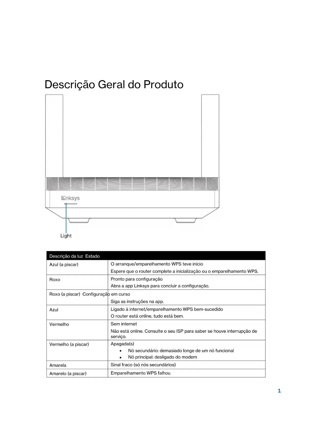 Descrição da luz Estado Azul (a piscar) O arranque/emparelhamento WPS teve início Espere que o router complete a inicialização ou o emparelhamento WPS. Roxo Pronto para configuração Abra a app Linksys para concluir a configuração. Roxo (a piscar) Configuração em curso Siga as instruções na app. Azul Ligado à internet/emparelhamento WPS bem-sucedido O router está online, tudo está bem. Vermelho Sem internet Não está online. Consulte o seu ISP para saber se houve interrupção de serviço. Vermelho (a piscar) Apagada(s)