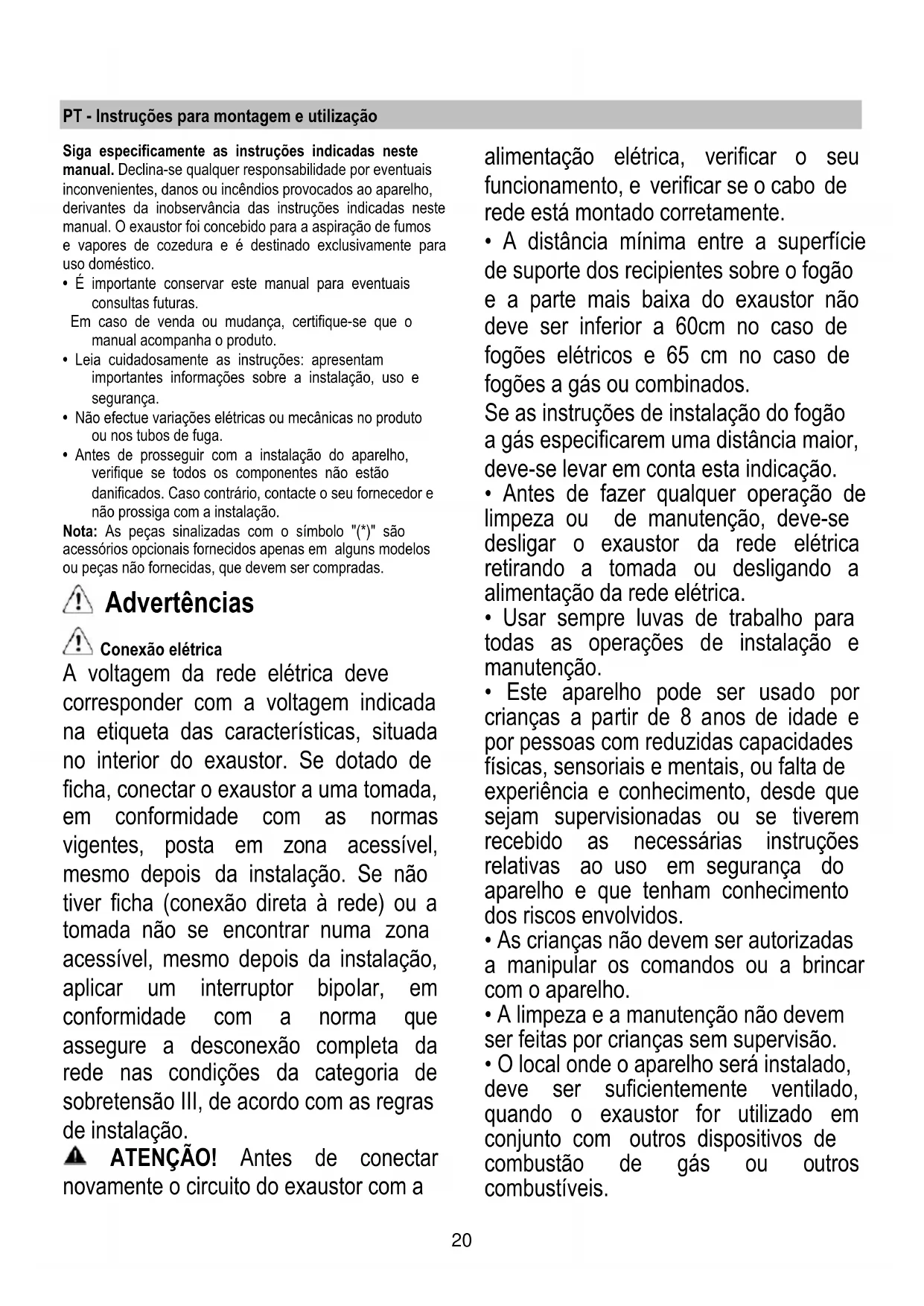 - Antes de prosseguir com a instalação do aparelho, verifique se todos os componentes não estão danificados. Caso contrário, contacte o seu fornecedor e não prossiga com a instalação. Nota: As peças sinalizadas com o símbolo "(*)" são acessórios opcionais fornecidos apenas em alguns modelos ou peças não fornecidas, que devem ser compradas. Advertências Conexão elétrica A voltagem da rede elétrica deve corresponder com a voltagem indicada na etiqueta das características, situada no interior do exaustor. Se dotado de ficha, conectar o exaustor a uma tomada, em conformidade com as normas vigentes, posta em zona acessível, mesmo depois da instalação. Se não tiver ficha (conexão direta à rede) ou a tomada não se encontrar numa zona acessível, mesmo depois da instalação, aplicar um interruptor bipolar, em conformidade com a norma que assegure a desconexão completa da rede nas condições da categoria de sobretensão III, de acordo com as regras de instalação. ATENÇÃO! Antes de conectar novamente o circuito do exaustor com a alimentação elétrica, verificar o seu funcionamento, e verificar se o cabo de rede está montado corretamente.