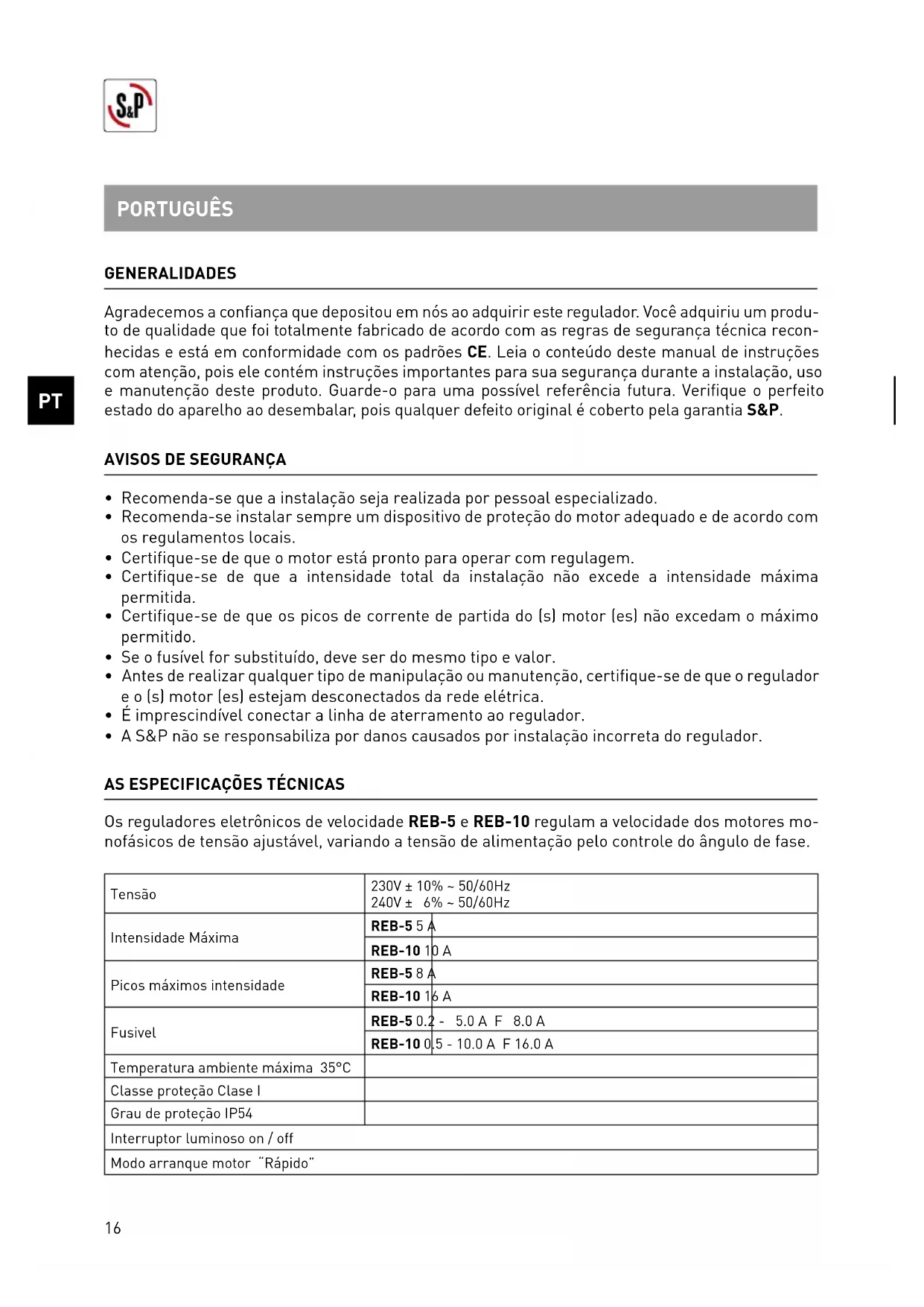 GENERALIDADES Agradecemos a confiança que depositou em nós ao adquirir este regulador. Você adquiriu um produ- to de qualidade que foi totalmente fabricado de acordo com as regras de segurança técnica recon- hecidas e está em conformidade com os padrões CE. Leia o conteúdo deste manual de instruções com atenção, pois ele contém instruções importantes para sua segurança durante a instalação, uso e manutenção deste produto. Guarde-o para uma possível referência futura. Verifique o perfeito estado do aparelho ao desembalar, pois qualquer defeito original é coberto pela garantia S&P.