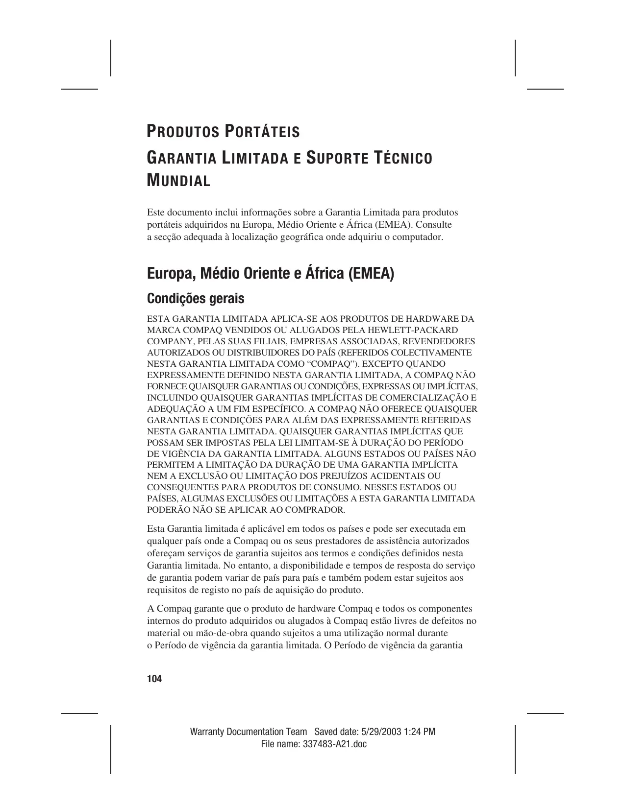 Warranty Documentation Team Saved date: 5/29/2003 1:24 PM File name: 337483-A21.doc Assegure-se de que possui as seguintes informações antes de ligar para a Compaq: – Número de série, identificação do produto e número do modelo do produto – Mensagens de erro aplicáveis – Opções adicionais – Sistema operativo – Hardware ou software de terceiros – Perguntas detalhadas Tipos de serviços de garantia Para que a Compaq possa fornecer o melhor suporte e serviço possíveis durante o período de Garantia, a Compaq encoraja fortemente os clientes a aceitarem a utilização de, ou a utilizarem as tecnologias de suporte disponíveis fornecidas pela Compaq. Estas tecnologias incluem diagnósticos, ferramentas de assistência à configuração e, onde apropriado, soluções de suporte remoto da Compaq (“Phone Home”). Se optar por não implementar as capacidades de suporte remoto disponíveis, podem ocorrer custos adicionais devido aos maiores requisitos de recursos de suporte. Se, normalmente, o produto portátil não for vendido pela Compaq no país de utilização, deverá ser devolvido para reparação a um país onde seja vendido e obtenha suporte. Nota: Os produtos portáteis têm suporte e assistência regional nos países seleccionados. Os computadores portáteis só podem obter suporte no país onde são adquiridos e comercializados. Se o comprador não se encontrar no país de compra, deverá pagar o custo de expedição do portátil para o local de reparação apropriado. Se não tiver a certeza sobre o suporte disponível para o seu computador portátil, contacte o Centro de Assistência a Clientes. Consulte o folheto Worldwide Phone Numbers para obter mais informações. A seguir são listados os tipos de serviços de suporte de garantia que podem ser aplicáveis ao produto que adquiriu. ANTES DE ENVIAR QUALQUER UNIDADE PARA ASSISTÊNCIA, ASSEGURESE DE QUE EFECTUA UMA CÓPIA DE SEGURANÇA DE TODOS OS DADOS E DE QUE RETIRA QUAISQUER INFORMAÇÕES CONFIDENCIAIS, EXCLUSIVAS OU PESSOAIS. A COMPAQ NÃO SE RESPONSABILIZA POR DANOS OU PERDA DE QUAISQUER PROGRAMAS, DADOS OU SUPORTES DE DADOS AMOVÍVEIS. A COMPAQ NÃO SE RESPONSABILIZA PELO RESTAURO OU REINSTALAÇÃO DE QUAISQUER PROGRAMAS OU