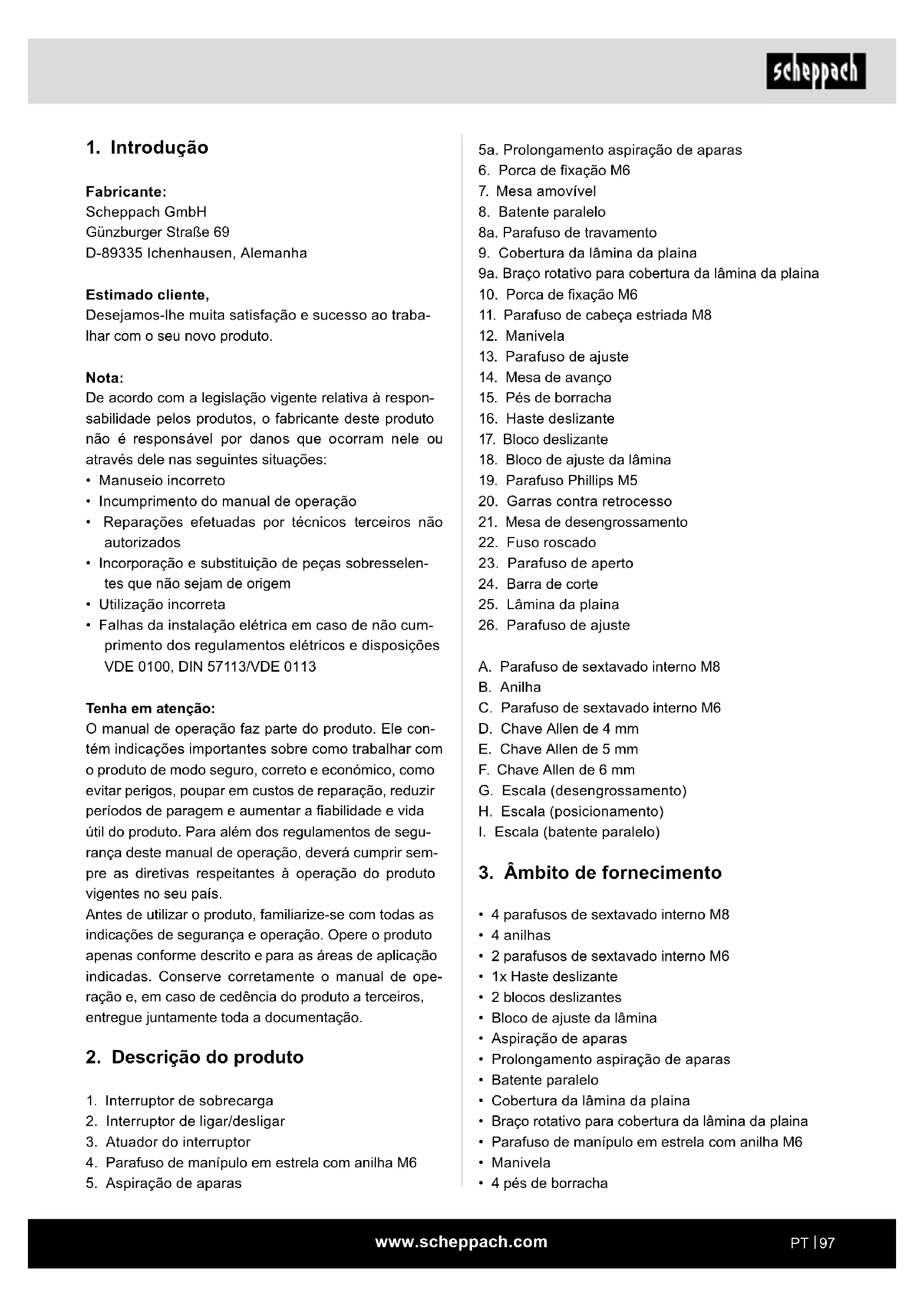 Fabricante: Scheppach GmbH Günzburger Straße 69 D-89335 Ichenhausen, Alemanha Estimado cliente, Desejamos-lhe muita satisfação e sucesso ao traba- lhar com o seu novo produto. Nota: De acordo com a legislação vigente relativa à respon- sabilidade pelos produtos, o fabricante deste produto não é responsável por danos que ocorram nele ou através dele nas seguintes situações: