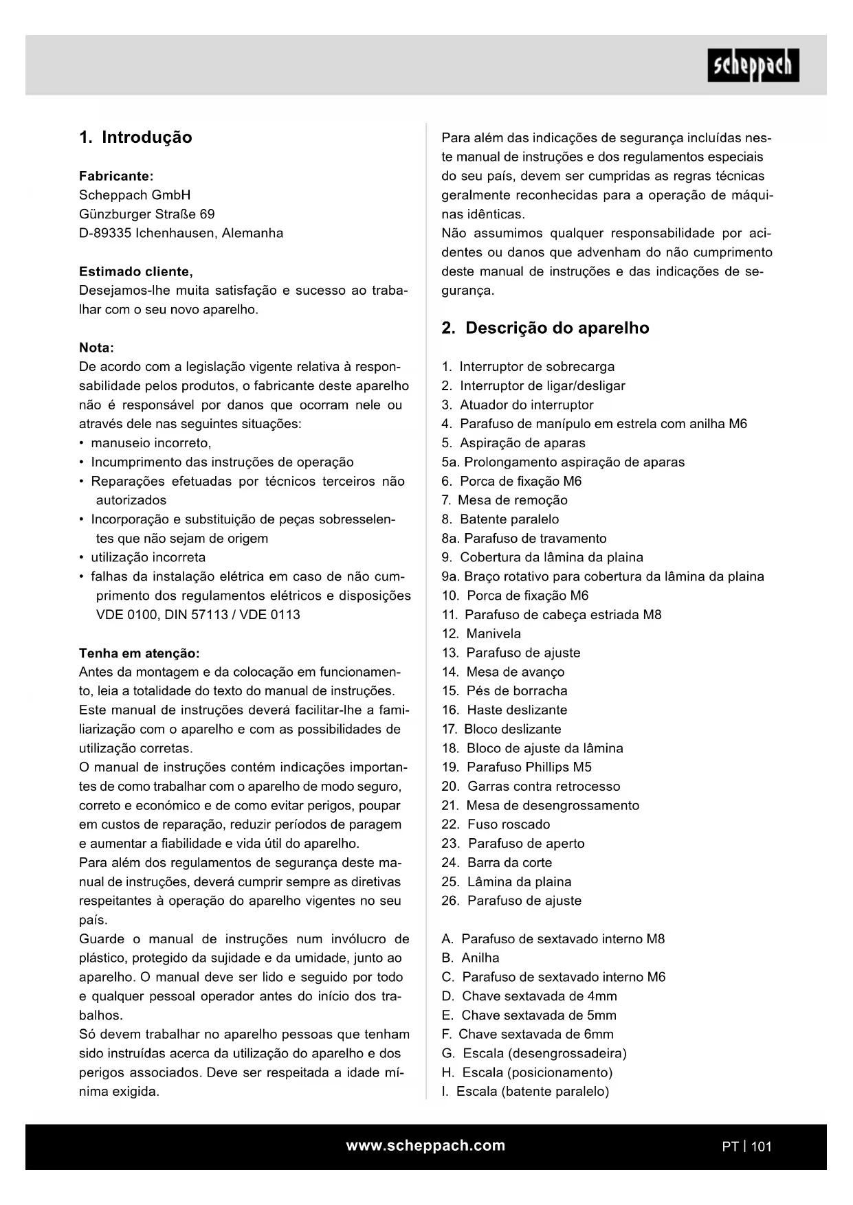Plaina desengrossadeira Tradução do manual de operação original 99www.scheppach.com 2www.scheppach.com