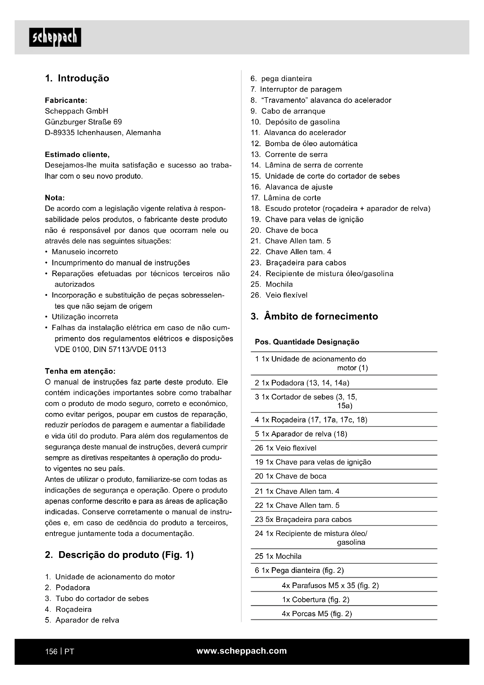 Fabricante: Scheppach GmbH Günzburger Straße 69 D-89335 Ichenhausen, Alemanha Estimado cliente, Desejamos-lhe muita satisfação e sucesso ao traba- lhar com o seu novo produto. Nota: De acordo com a legislação vigente relativa à respon- sabilidade pelos produtos, o fabricante deste produto não é responsável por danos que ocorram nele ou através dele nas seguintes situações: